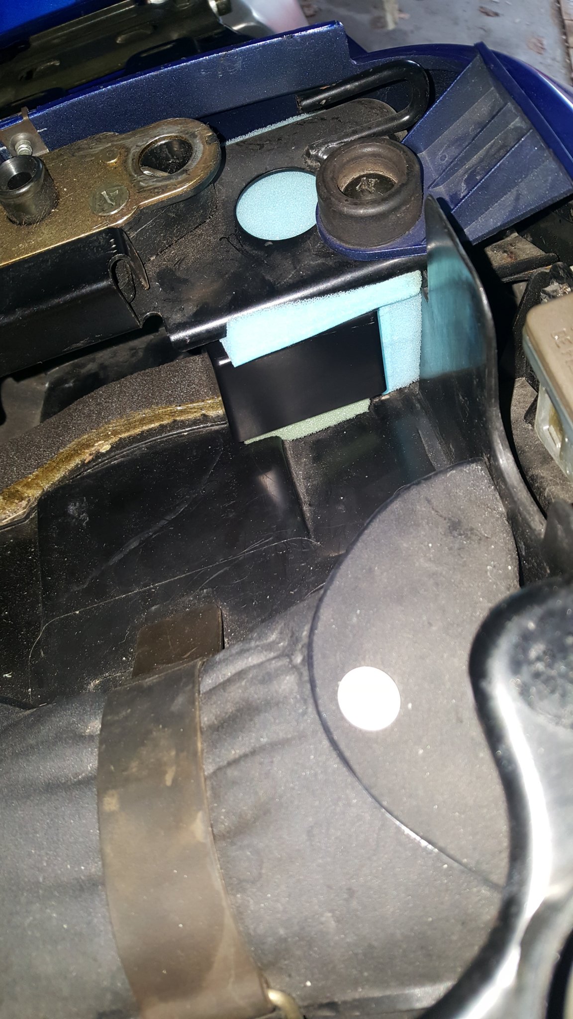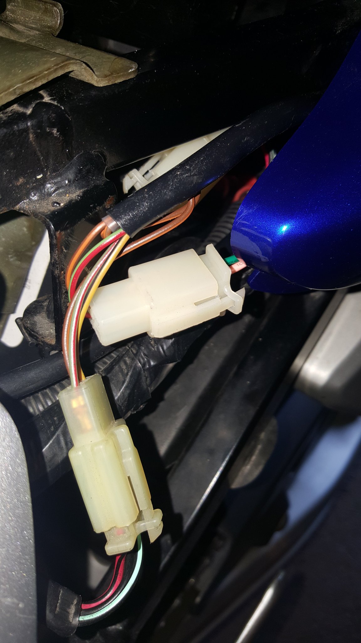 12V Zündungsplus habe ich unterm Tank rechts an einem vorhandenen nicht benutzten Stecker abgegriffen und unterm Tank nach hinten verlegt.