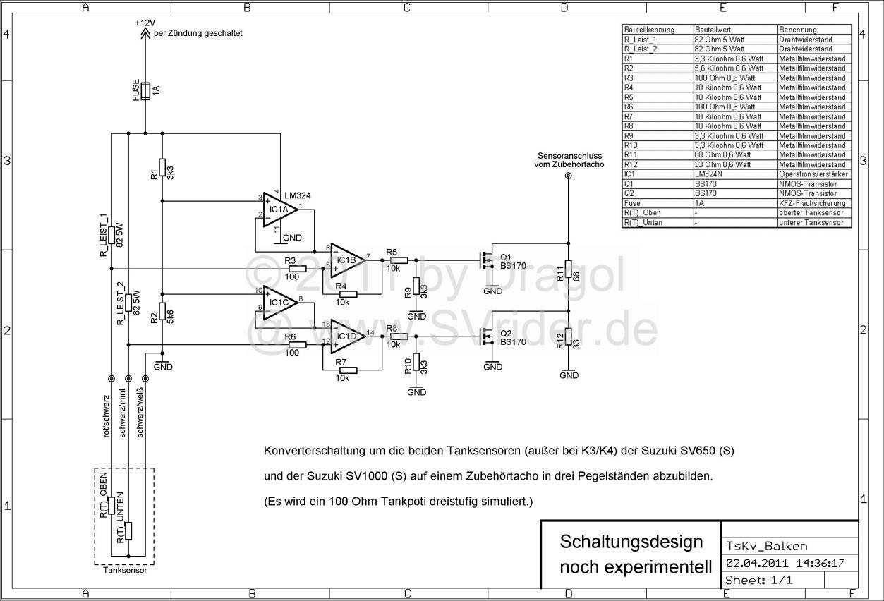 Vorweg, ich habe die Schaltung für die Tankanzeige leicht modifiziert, die IC1B und IC1D habe ich vertauscht.