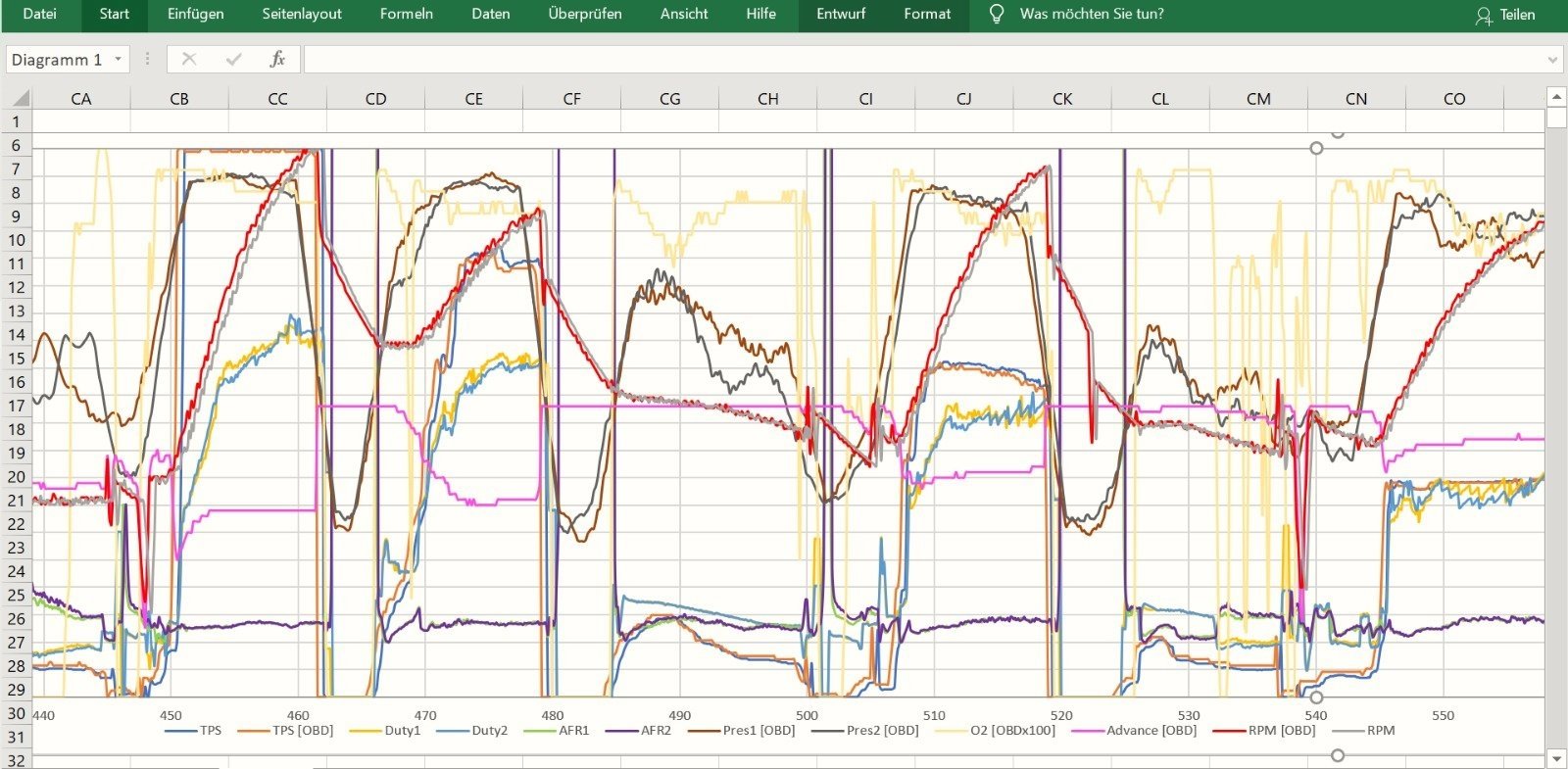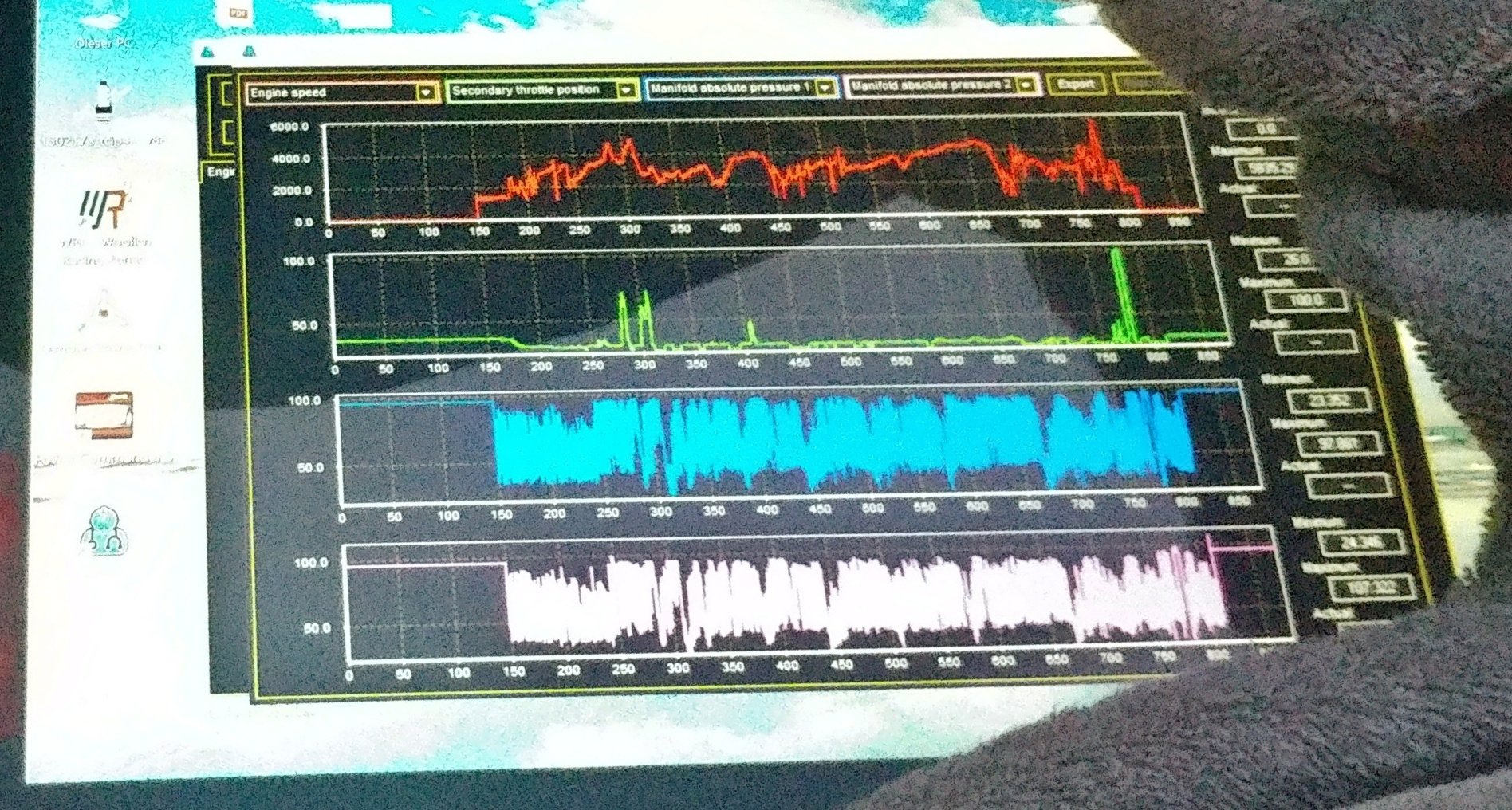 Ich hab es mal selbst probiert und versucht aus den Daten ein sinnvolles Drucksignal zu erhalten (zu ECU Flash Zwecken). Indem man einen mathematischen Filter mit verstellbarer Gewichtung drüber legt, kommt ein einigermaßen brauchbares Signal heraus. Siehe hier die Signale in Braun und Dunkelgrau. Im Stand, wo so starke Schwingungen drin sind, klappt es allerdings nicht so gut, dass ich damit Synchronisieren würde.
