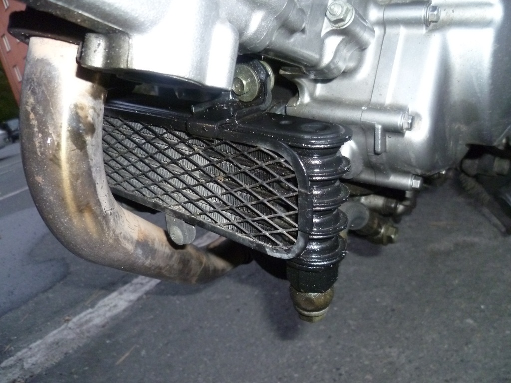 die Gladius hat keinen Ölkühler, aber einen Wärmetauscher zum Kühlwasser, das ist ein Zwischenring hinter dem Ölfilter der mit dem Kühlwasserkreislauf verbunden ist! Also das schnell aufheizende Wasser wärmt am anfang das Öl mit, und später kühlt sich das heissere Öl am Kühlwasser ab.