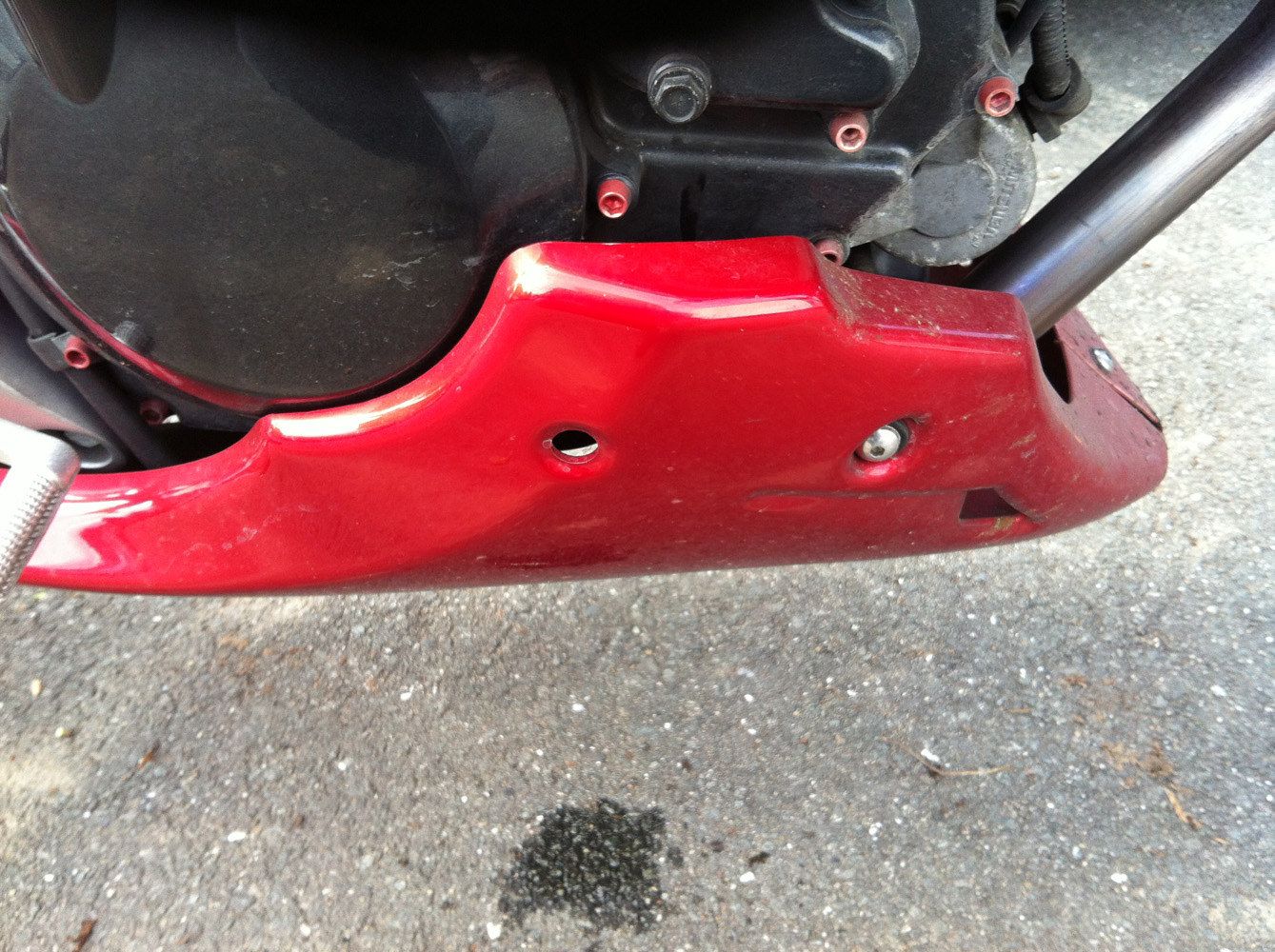 ich habe heute meine kleine zum erstem Mal diese Jahr wieder gestartet. Lief auch alles gut, hab sie ein bisschen im Leerlauf und ein bisschen auf 3000 U/min laufen lassen. Nachdem ich sie ausgestellt hatte hab ich bemerkt, dass sie ein bisschen Öl verloren hat (Bilder). Ich hab sie dann wieder angestellt, um zu sehen wo es rausläuft. Habs auch gefunden, aber es lief nichts mehr raus.