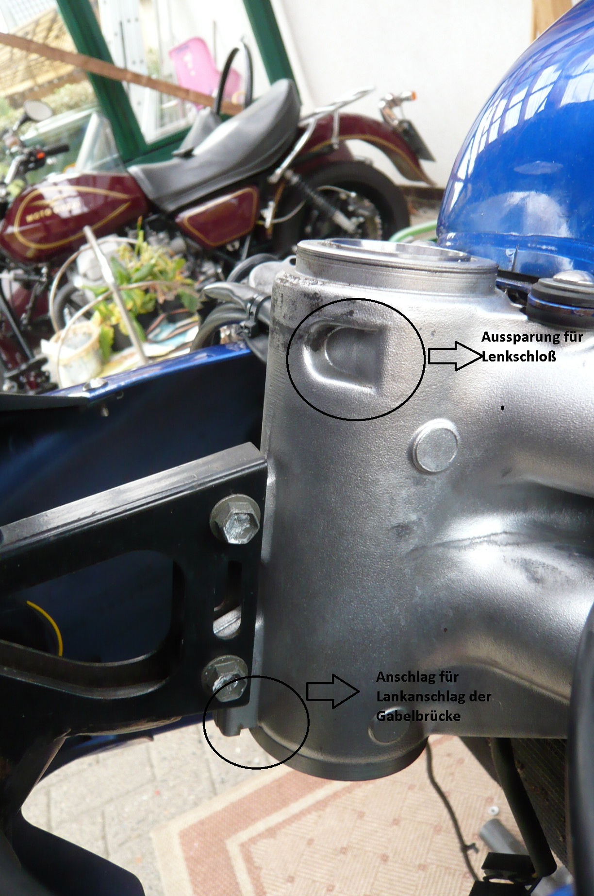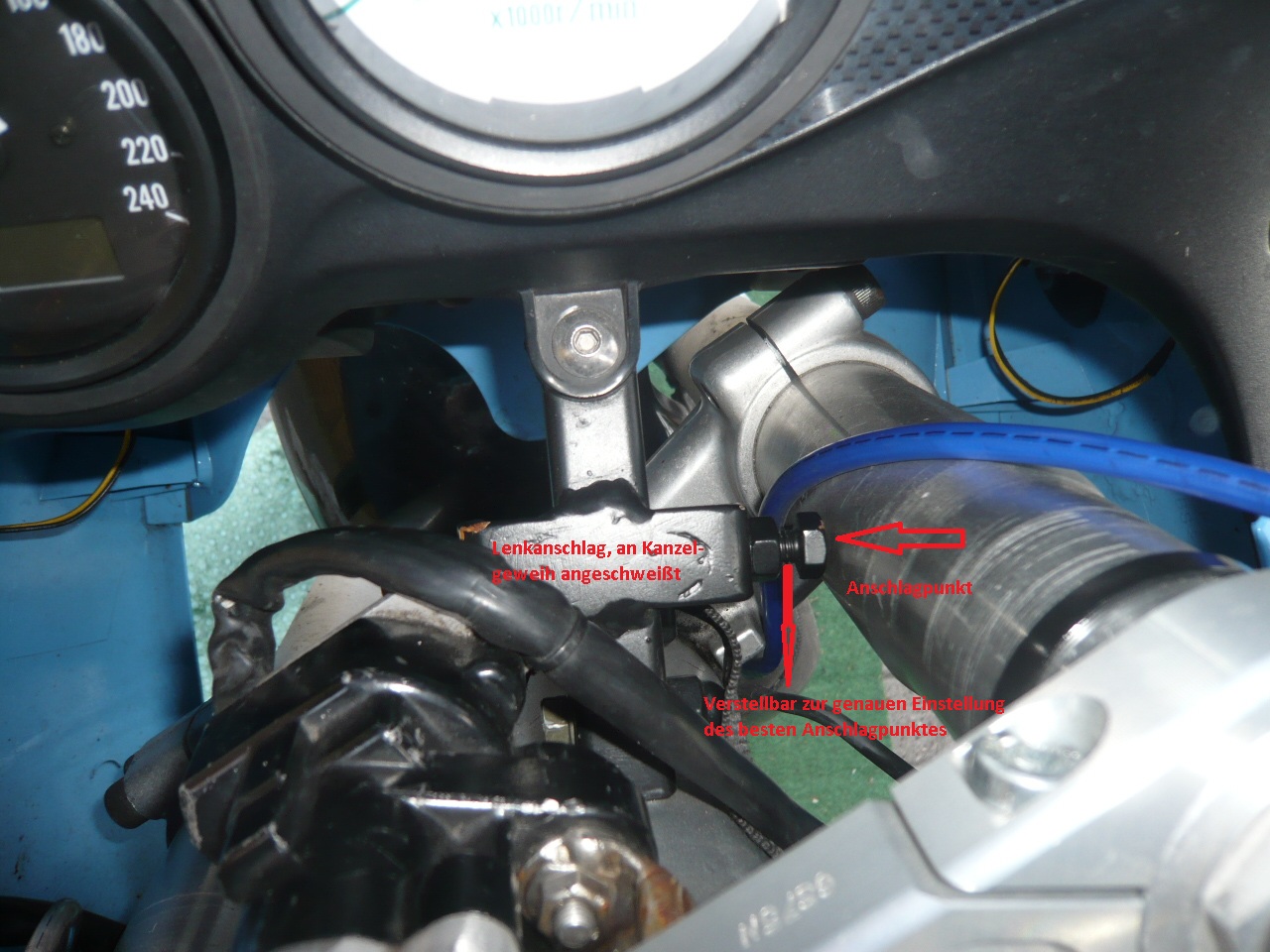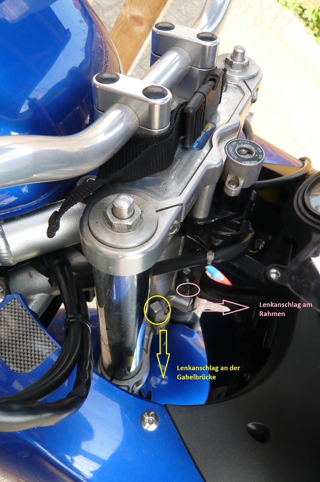 Nun habe ich bei der SV650 das Problem das die Begrenzer der unteren Brücke top aussehen. Beim Anschlag verschwinden diese aber in einer scheinbar vorgesehenen Aussparung am Lenkkopf. Und Begrenzt wird gar nichts. Auf beiden Seiten ist das Ende erreicht wenn Lenker den Tank berührt.