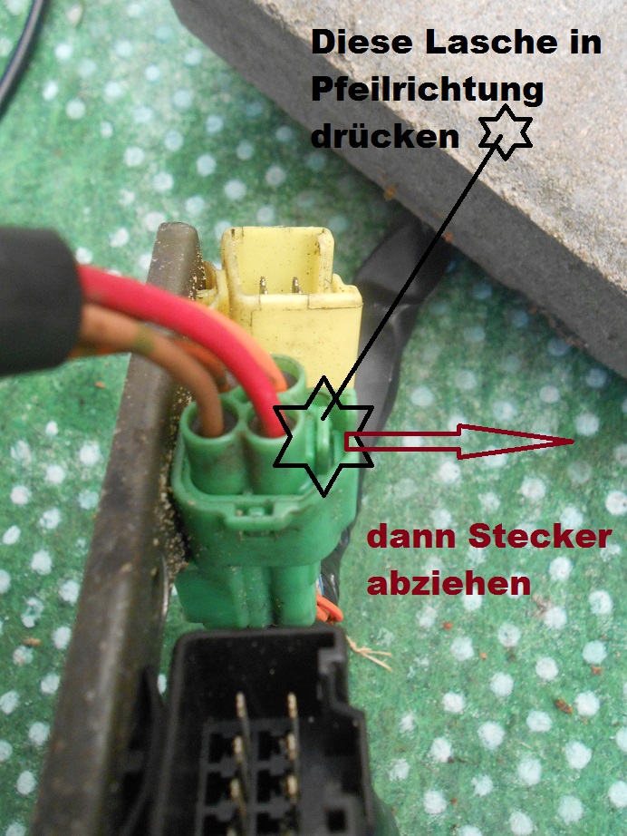 Ergo, nicht von seitlichen sichtbaren Arretierungsnasen beirren lassen, die zum Aufspreizen/Aufweiten verleiten, die interessieren im Grunde nicht, die fixieren nur den eingeklipsten Adapterring in der Buchse! Wird der Ring entfernt, die Nasen angebrochen oder rundgelutscht, hält die Steckermimik nachher nicht mehr richtig zusammen und der Kontakt wird bei möglichem leichten Zug (z.b. einschlagen des Lenkers) getrennt.