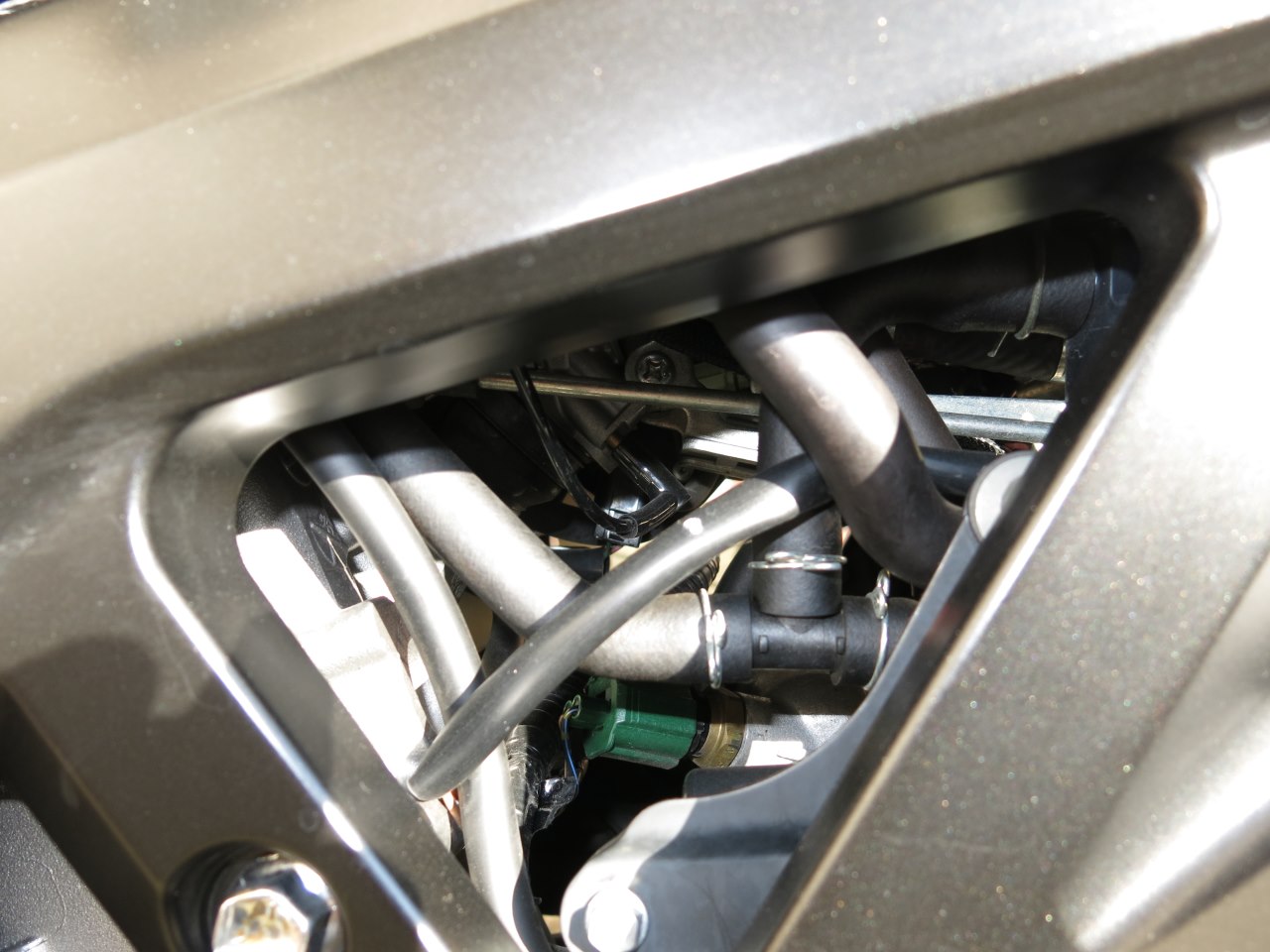 Beim Schlauch verlegen aufpassen, dass das Moped ja auch federt, also ein wenig Luft lassen. Am Rahmen und so habe ich mit kleinen Kabelbindern befestigt, hat man nicht wirklich gesehen.