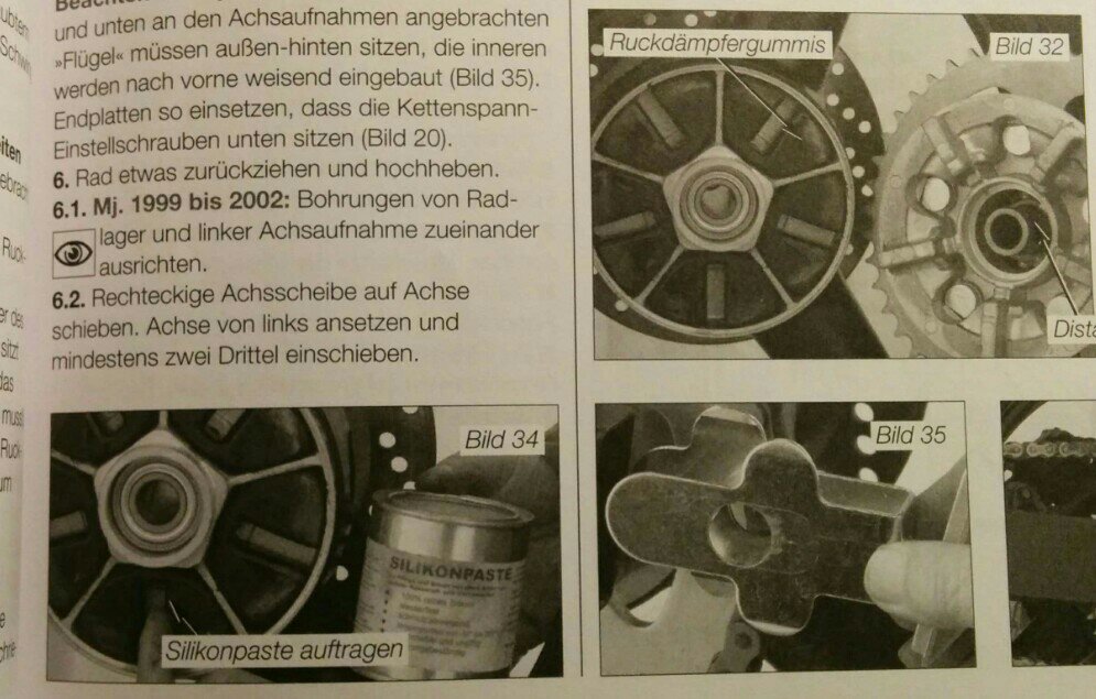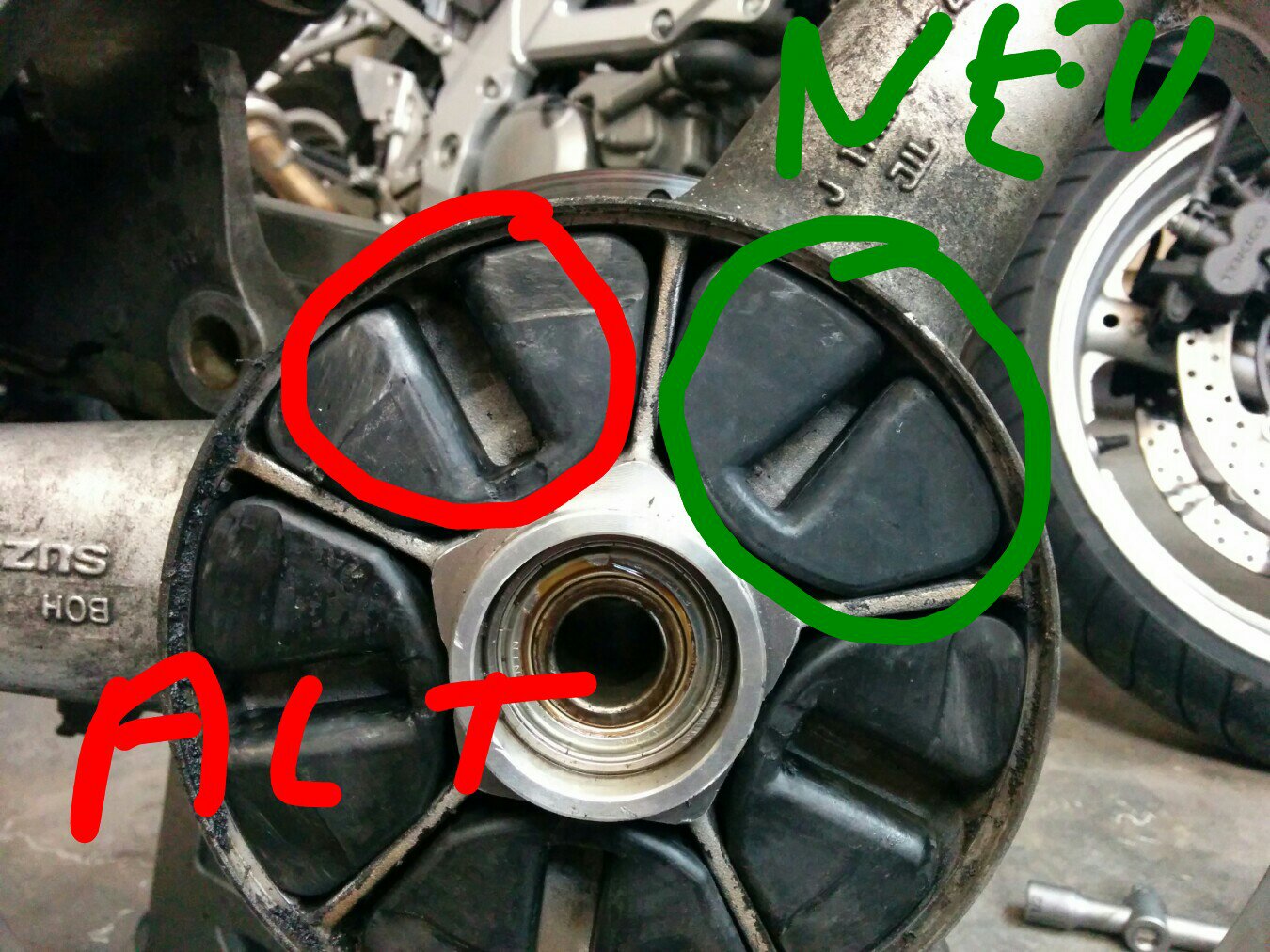 nachdem wir heute mal kurz Mopped waschen waren, und ich mich gerade um die Kette gekümmert habe, ( die sowieso total am Ende ist und DRINGEND neu muss :oops: ) sind mir die Ruckdämpfer aufgefallen. Wenn ich das Rad festhalte und dann am Kettenrad "drehe" habe ich dort ein sehr deutliches Spiel.