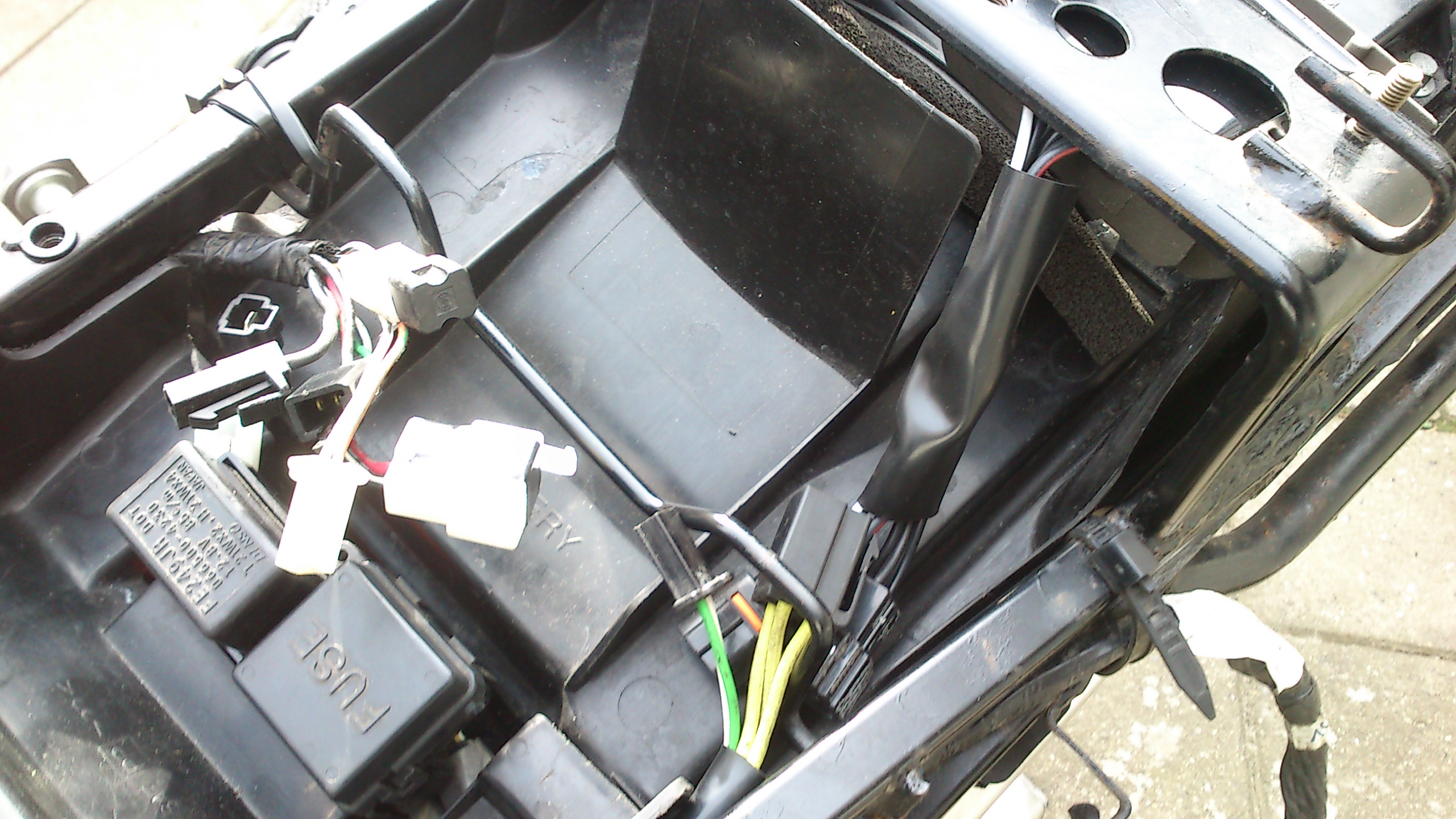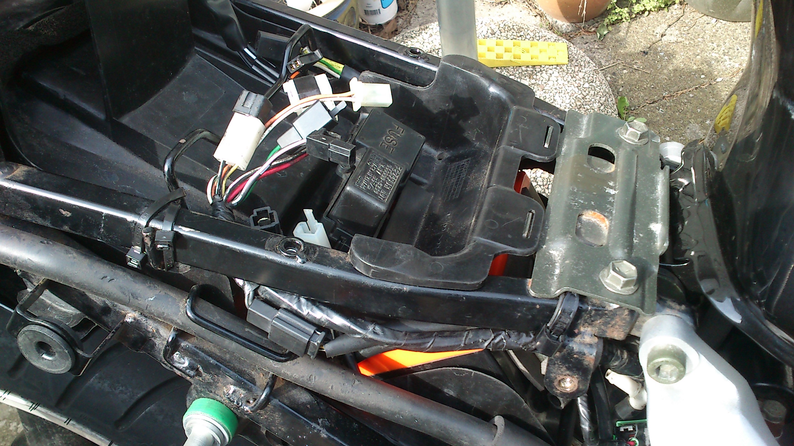 Da er viel grösser ist als der original, neuer Platz unter der Sitzbank- Masse. Alle Kabel nach links gelegt und extra isoliert. Kabelbruch 3 fach !!!! Stecker geändert. 2 mal 12Volt. Extra Leitung zur Batteri mit Schmelzsicherung 2,5 A.