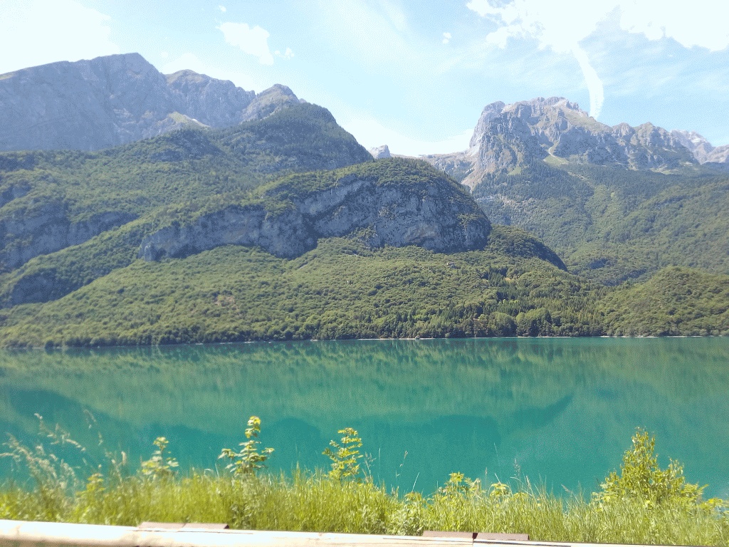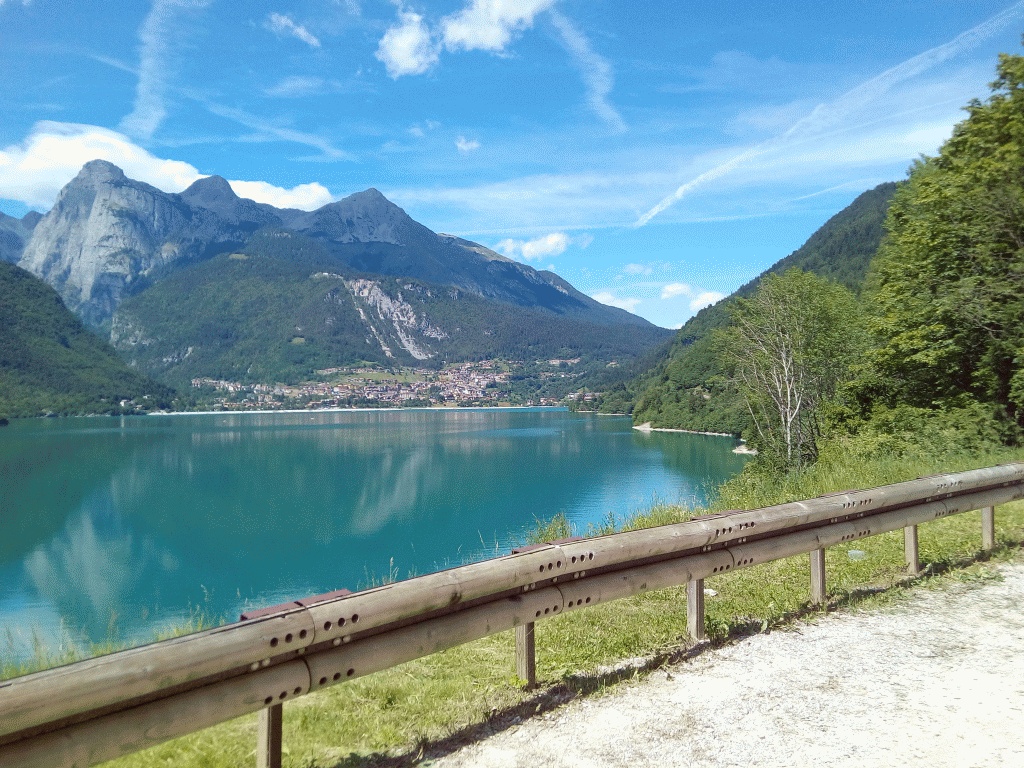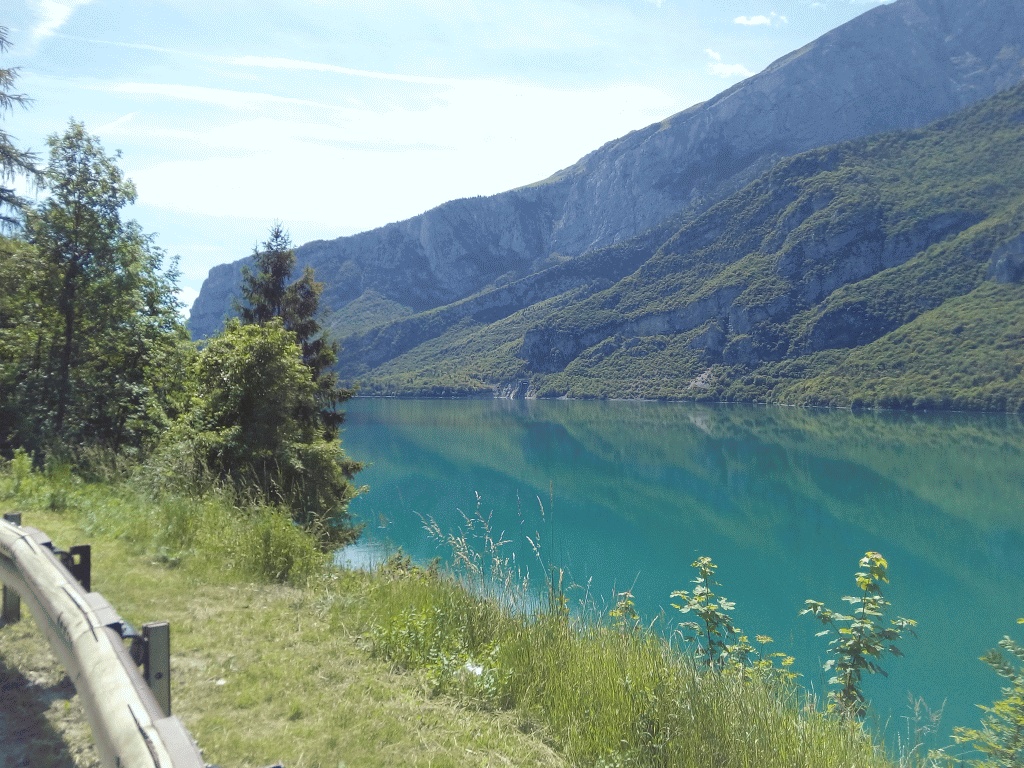 Die Abzweigung nach Lodrone verpasse ich und fahre die SP 669 zum See runter und werde mit einer spektakulären Aussicht belohnt. Die Straße nach unten ist gut und breit und hat ein paar Kurven. Leider kann man nirgends richtig zum Photographieren stehen bleiben…also dreh ich unten rum, GAAAS!, und fahre wieder rauf, oben mach ich dann ein paar Bilder.