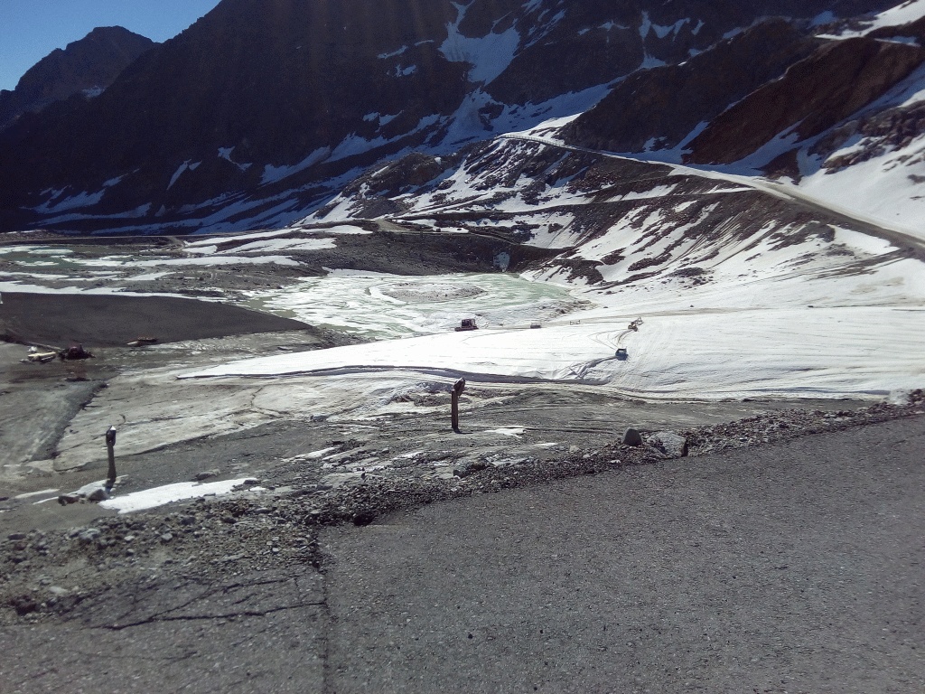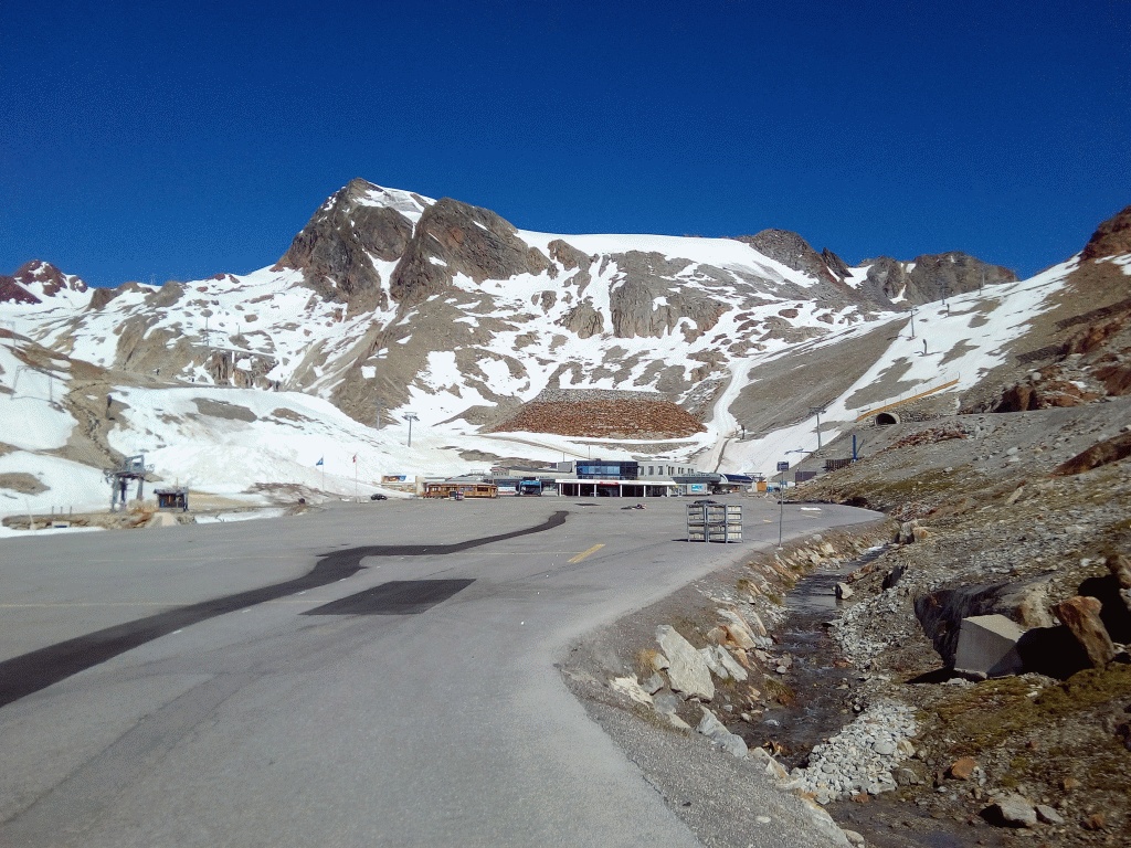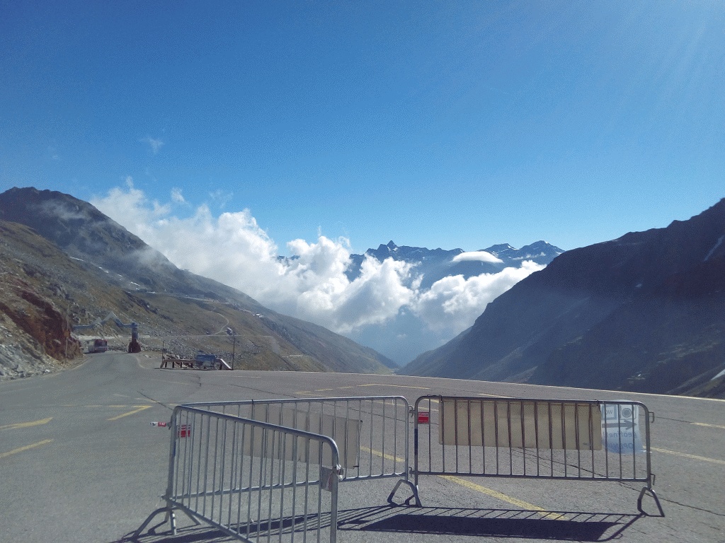 Weils fast am Weg liegt noch ein Abstecher aufs Stilfser Joch, 10 Kehren rauf, die Abfahrt Richtung Prad ist wegen der beschissenen Sportveranstaltung gesperrt, oben wird fleißig der Zieleinlauf aufgebaut. Hat aber auch Vorteile, wenig Verkehr; Die Sperre war tatsächlich vorher durch Schilder angekündigt.