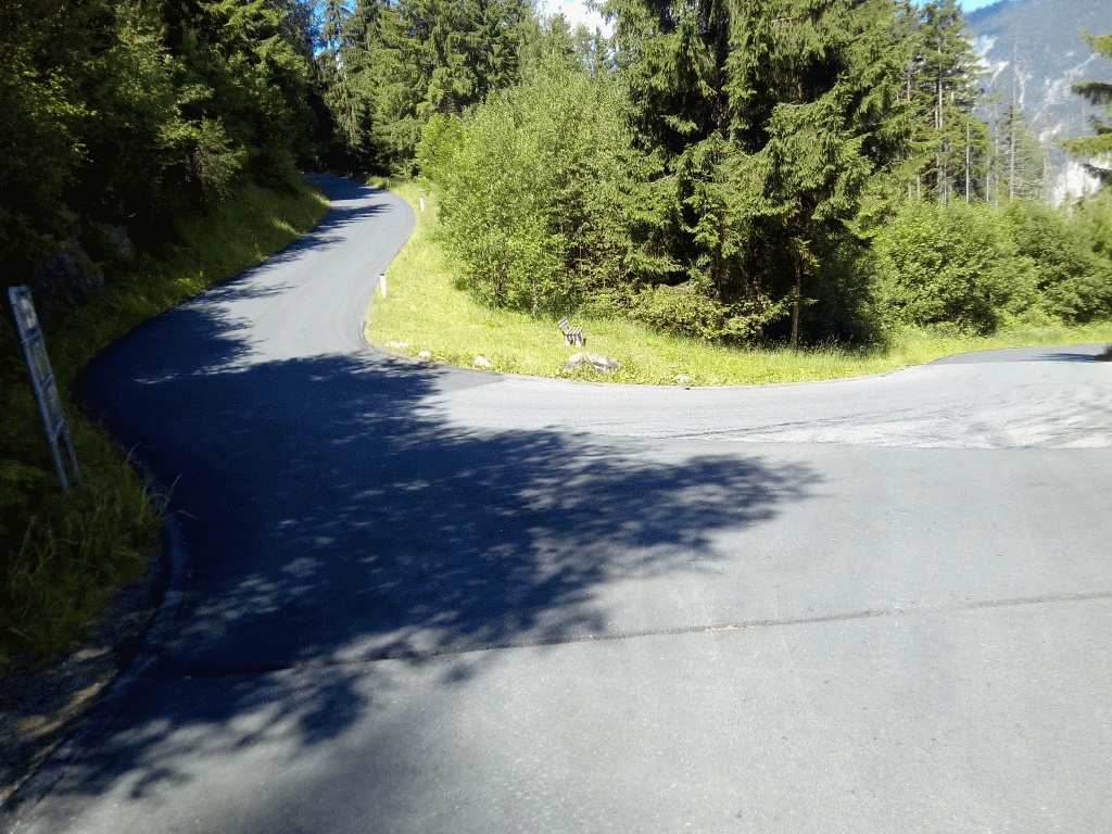 Die Strecke ist toll, leer, keine Kieberer, ich brenn wieder rauf und dann, tatsächlich finde ich das vermisste Schild, aus der Gegenrichtung nicht zu erkennen und die Straße erinnert eher an den Einstieg zu einem Wanderweg. Steil, einspurig, 2 Kehren drin.