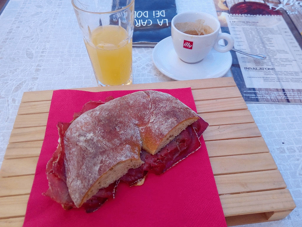 Eigentlich bin ich jetzt richtig alle, muß aber weiter, auf dem Weg zum Splügen rauf mach ich a bisserl Brotzeit und fülle in einer Bar caffé nach und lasse einen Liter acqua gassata in mir verdampfen.