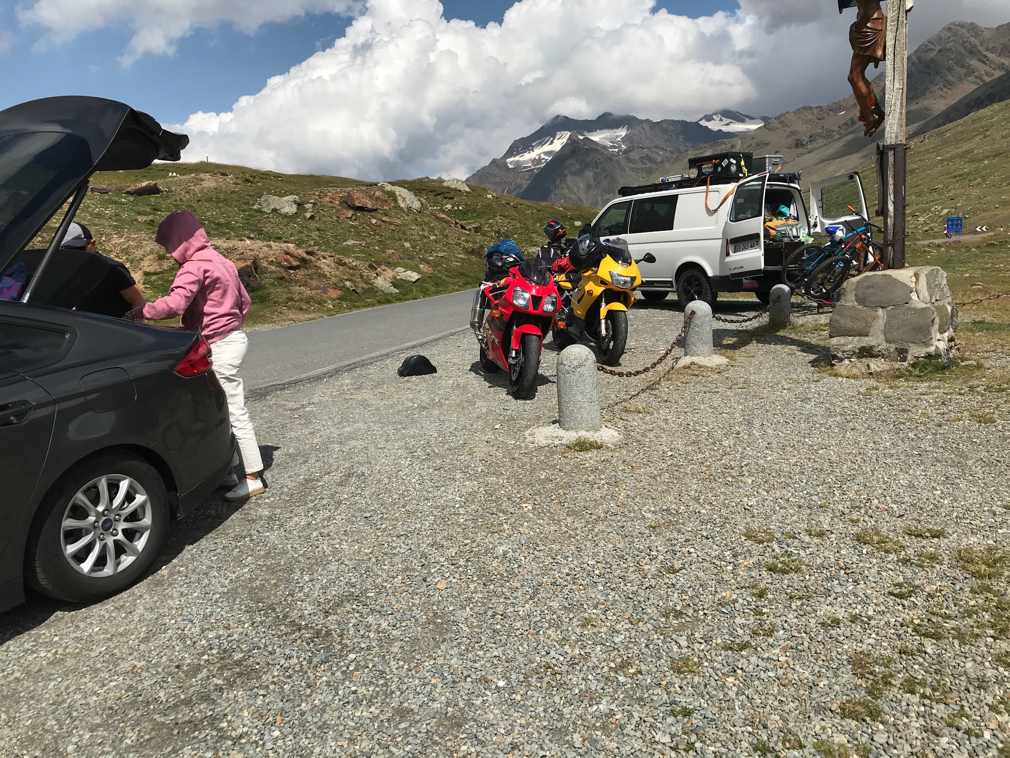 Wir wollten zu dritt mit 2 Übernachtungen in die Alpen und dabei über den Stelvio. Einer von uns (D.) hat die Übernachtungen gebucht und der andere (J.) hat mich dann am Sonntag morgen abgeholt, was schon mal schlecht anfing, da sich auf dem Weg zu mir an seiner Morini der Schalthebel gelockert hat. Dann haben wir D. in Gmünd eingesammelt und dort nochmal den Schalthebel befestigt. D. ist dann vorgefahren und dabei zwischen Ulm und Bieberach ein Stück Schnellstraße gefahren (war von der Ortsumgehung Meran abgesehen das einzige auf der Tour). Ich bin hinten gefahren und habe kurz vor der Abfahrt gesehen, dass der Schalthebel der Morini am Boden schleift. Es waren die Schraube und die Hülse weg. J. hat dann dort mit etwas Draht den Schalthebel wieder dran getüddelt und ist über Autobahn nach Heilbronn nach Hause gefahren. Da waren`s nur noch zwei...