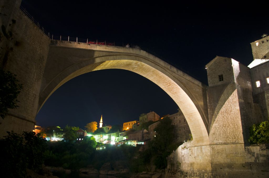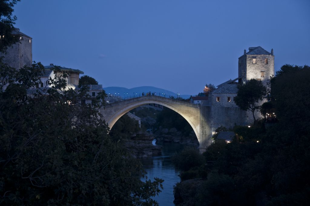 Die im 16. Jahrhundert gebaute Stari Most ("alte Brücke") wurde zu Beginn des Bosnienkriegs 1993 zerstört und war ein Symbolbild des Krieges. Erst 2004 wurde sie wieder aufgebaut und erstrahlt wieder als Wahrzeichen von Mostar.