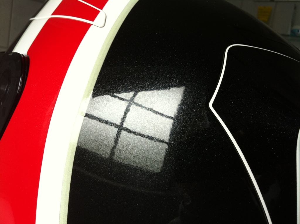 Der Helm hat so ein leichtes Metallic Finish im Lack. Besonders an den schwarzen Stellen sieht man es bei Tageslicht sehr gut. Er glänzt mit diesen winzigen Punkten einfach nur geil!