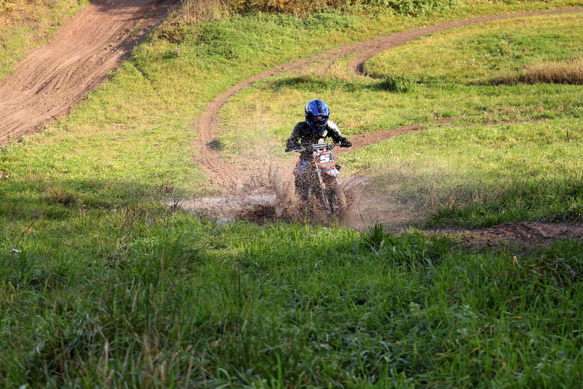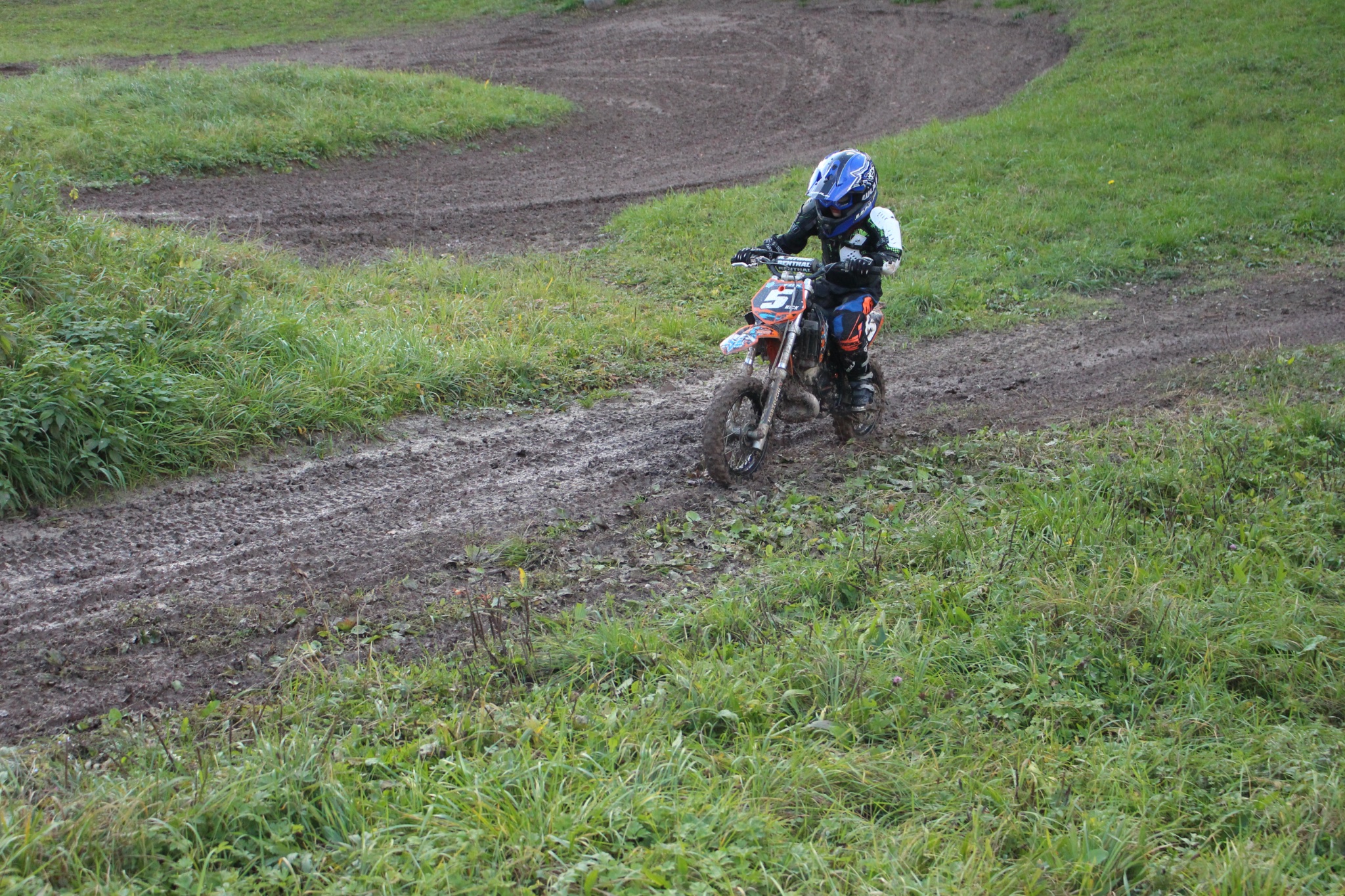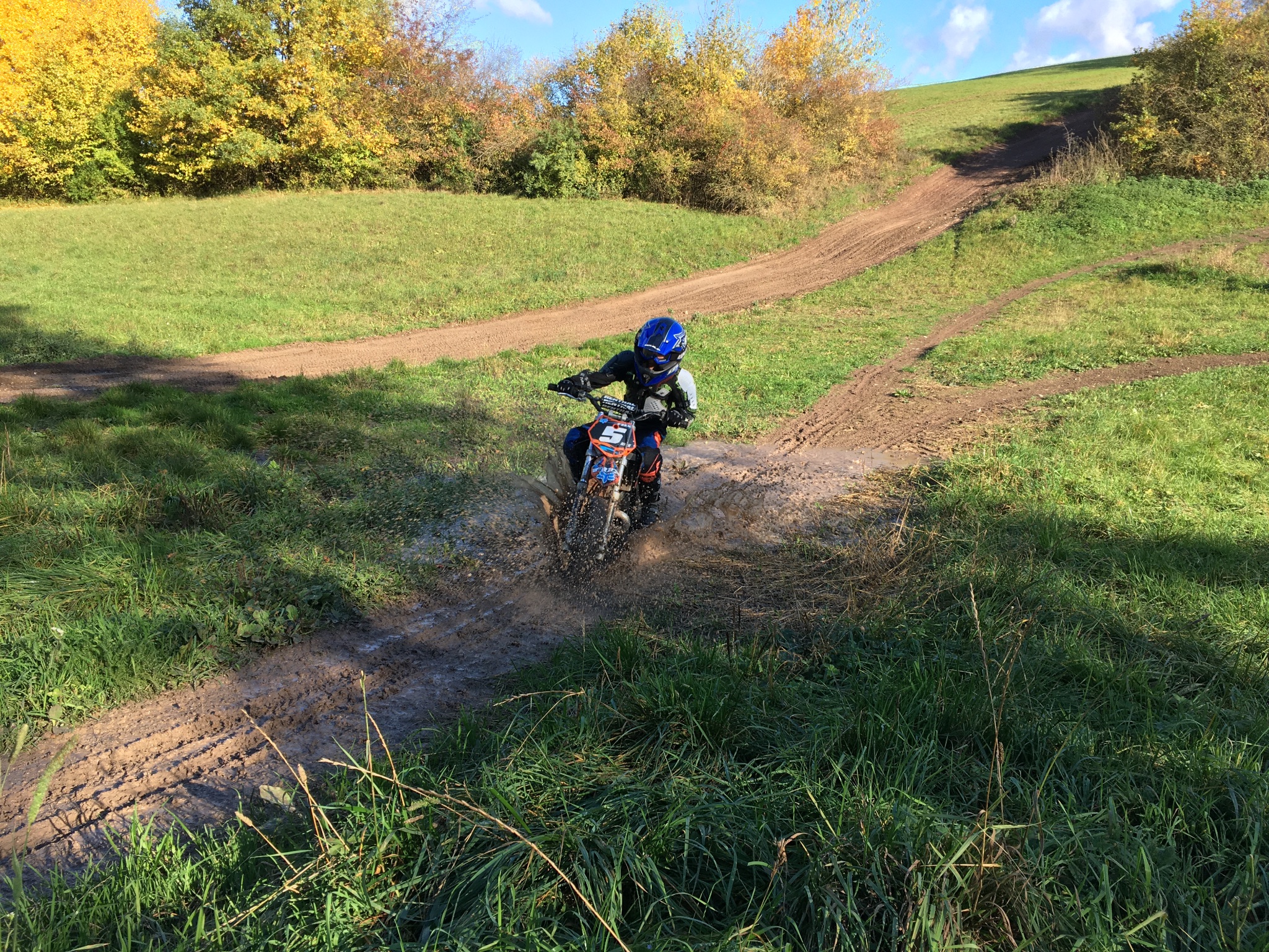 Jedenfalls hat sie jetzt den neuen Ansaugflansch und wir wollten am Donnerstag bei schönem Wetter zum Training gehen und ausprobieren, wie sie läuft. Kam mal wieder etwas dazwischen und deshalb sind wir am Samstag gegangen. Freitag den ganzen Tag und auch die Nacht auf Samstag hat es geregnet. :( Am Samstag nachmittag waren wir dann die einzigen auf der Strecke und sind auch nur auf die Kinderstrecke. Die war schon unfassbar rutschig. Auf der großen Strecke wäre er vermutlich einfach in einem Schlammloch stecken geblieben. Die Kurven waren diesmal der einfache Teil der Strecke, da in der Sonne und nur feucht. Das Hauptproblem für den Kleinen waren die Geraden auf denen das Hinterrad die ganze Zeit durchgedreht hat. Aber es hat ihm wirklich Spaß gemacht und solche Bedingungen schulen natürlich, sauber zu fahren und auf die Linie zu achten. Er ist auch nur drei Mal gestürzt (jeweils auf einer Geraden, weil er zu quer stand), was ich recht beeindruckend fand. Wenn ich gefahren wäre, hätte ich das Moped wahrscheinlich jede Runde aufheben müssen...