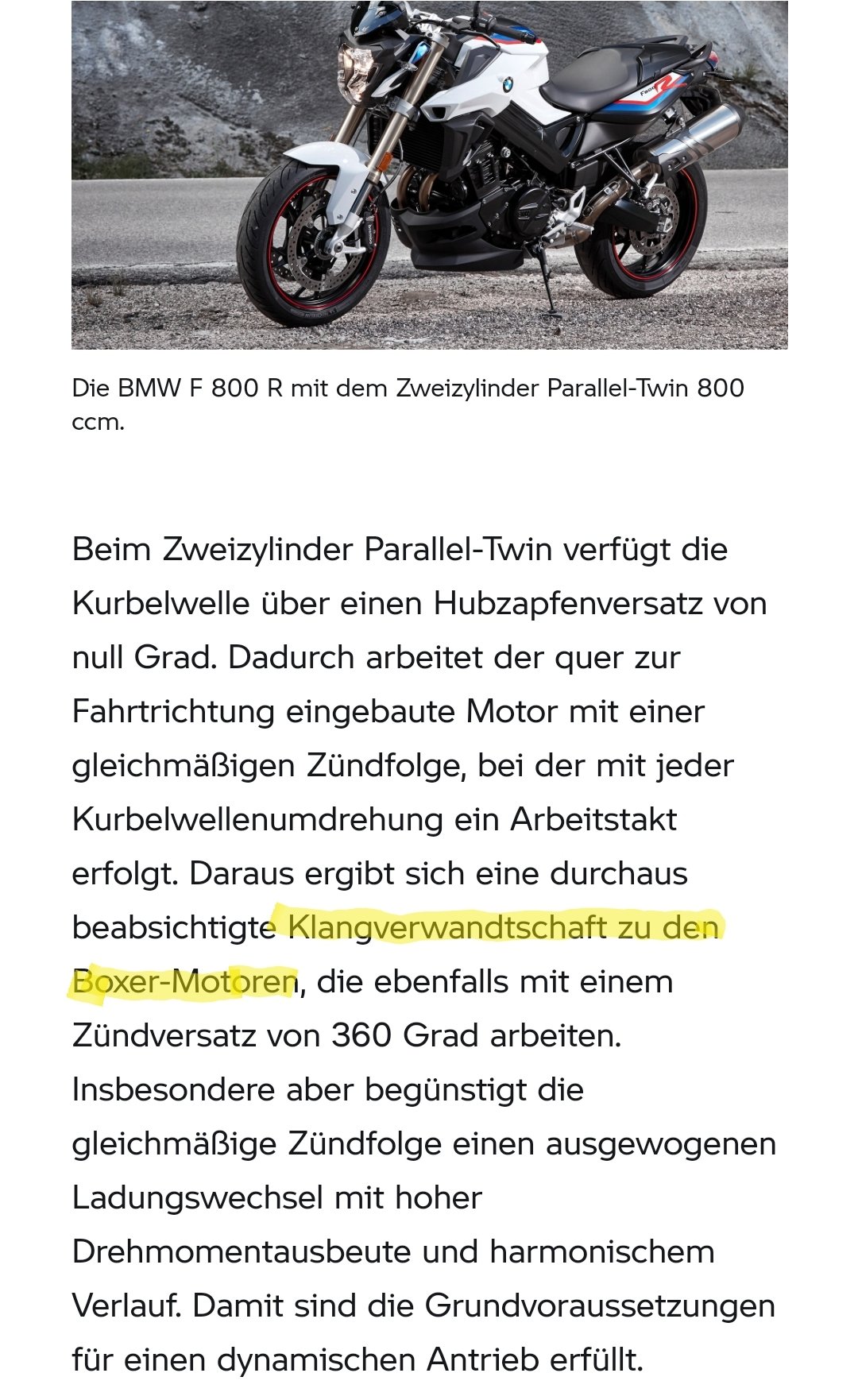 Ich dachte eigentlich es sei unter "Motorradexperten" :wink: allgemein bekannt, dass der F800 Motor akkustisch Anleihen beim Boxermotor aus eigenem Haus nimmt.