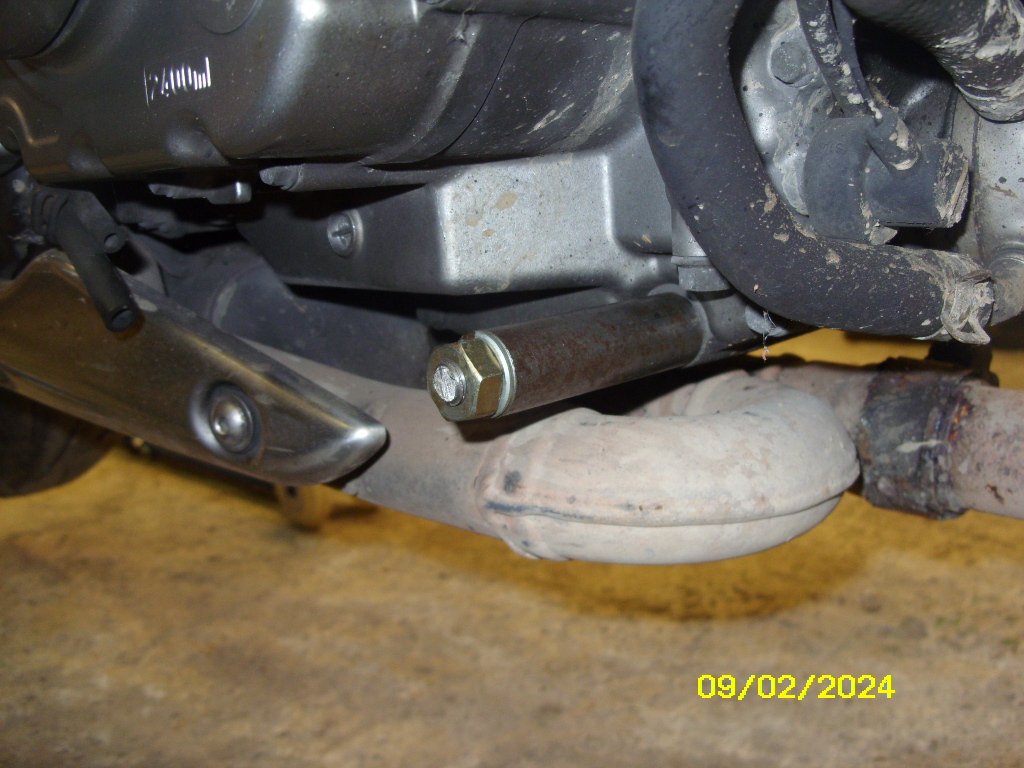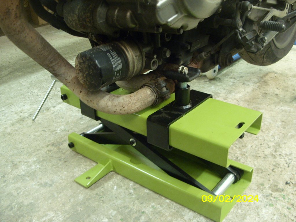 Zwei Buchsen und eine lange Schraube hergestellt. Jetzt lässt sich ein Scherenheber sicher ansetzen. Die Maschine steht dann noch leicht auf dem Hinterrad. Dem Ausbau der Gabeln und des Lenkkopflagers steht nun nichts mehr im Wege. Durch Hochhängen des Hecks mit wenig Kraft ist wahlweise auch die Schwinge bereit zum Ausbau. Abgesehen vom Zeitaufwand Kosten gleich Null.