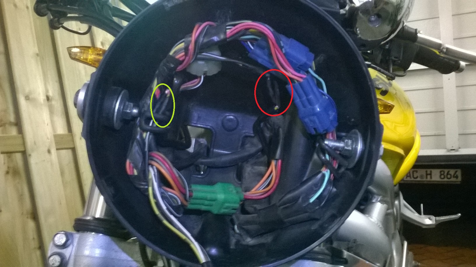 Grüner Kreis: Verbindung für den Blinker rechts -> normalerweise ein kleiner schwarzer Stecker!