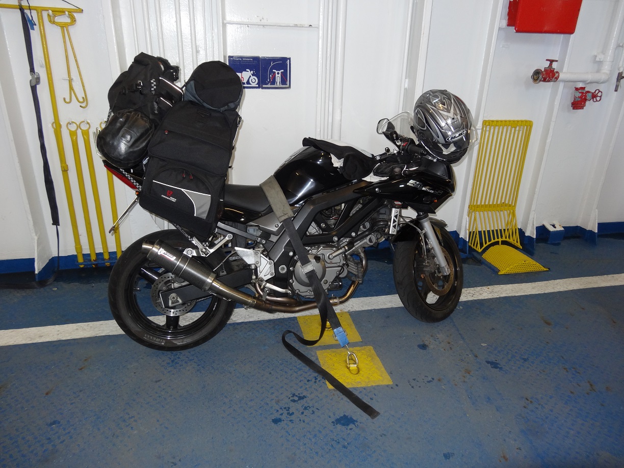 Zum Gurt: Wenn Du sichergehen willst, nimm (zwei) eigene mit ... kosten mit Zuglasten bis 300kg 5-7€ das Stk. im Baumarkt ... nicht jede Fähre hat ausreichend oder überhaupt Spanngurte ... hab schon selbst erlebt, das Leute ihre Mopeds mit Stricken an der Bordwand festbinden mussten. Auch die Reedereien raten zu eigenen Spanngurten.
