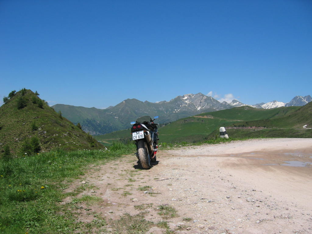 Sag das nicht. Bis auf den Zeltplatz, den du da auf der Hochalm siehst, sind Motorräder jeglicher Art gefahren, obwohl die Strecke bis dahin auch ähnlich aussah. Und auch auf dem weiteren Weg hab ich neben einigen großen GSen auch die eine oder andere Straßenmaschine gesehen. Aber meine SV hätte ich da auch nicht hochquälen wollen...