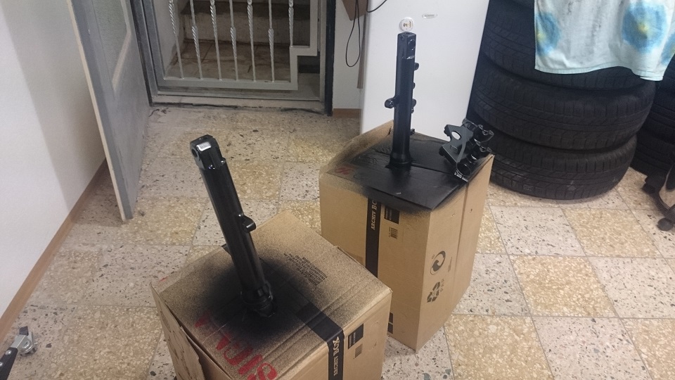 Danach Front auseinanderreißen und Lenkkopflager tauschen.Dabei gleich die Gabel und Gabelbrücken mit Foliatec PlastiDip Glanzschwarz lackieren