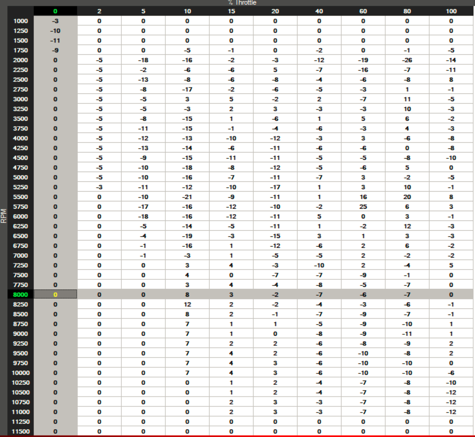 Wenn du AFR 12 bei hohen Drehzahlen eingestellt hast wird bei der SV nicht getrimmt. Auch in der originalen Fuel Table steht der Wert auf Null. Also keine Anpassung. Die SV hat dort im Suzuki Mapping wohl auch ne "12" eingetragen.SV16 hat geschrieben: ↑31.05.2019 23:53Von alleine geht das Autotune überhaupt nirgends hin. Man gibt den AFR Sollwert ein und im Trim Bereich werden die entsprechenden Vorschläge zur Umsetzung gemacht. Es ist allgemein bekannt daß AFR 12 zu fett ist, lässt sich ja auf dem Prüfstand einfach ermitteln. deshalb meine Frage warum