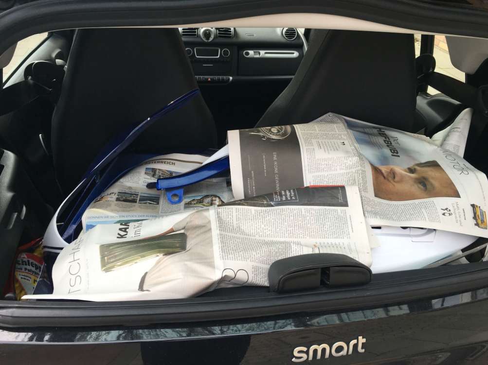 In diesem Zusammenhang musste ich auch feststellen, dass eine SV (Kanzel/Kanzelunterverkleidung/Heck/Heckunterverkleidung/Tank/Griff am Heck/ Kanzelinnenverkleidung/Fender/HRA) locker in den Kofferraum meines Smarts passt: