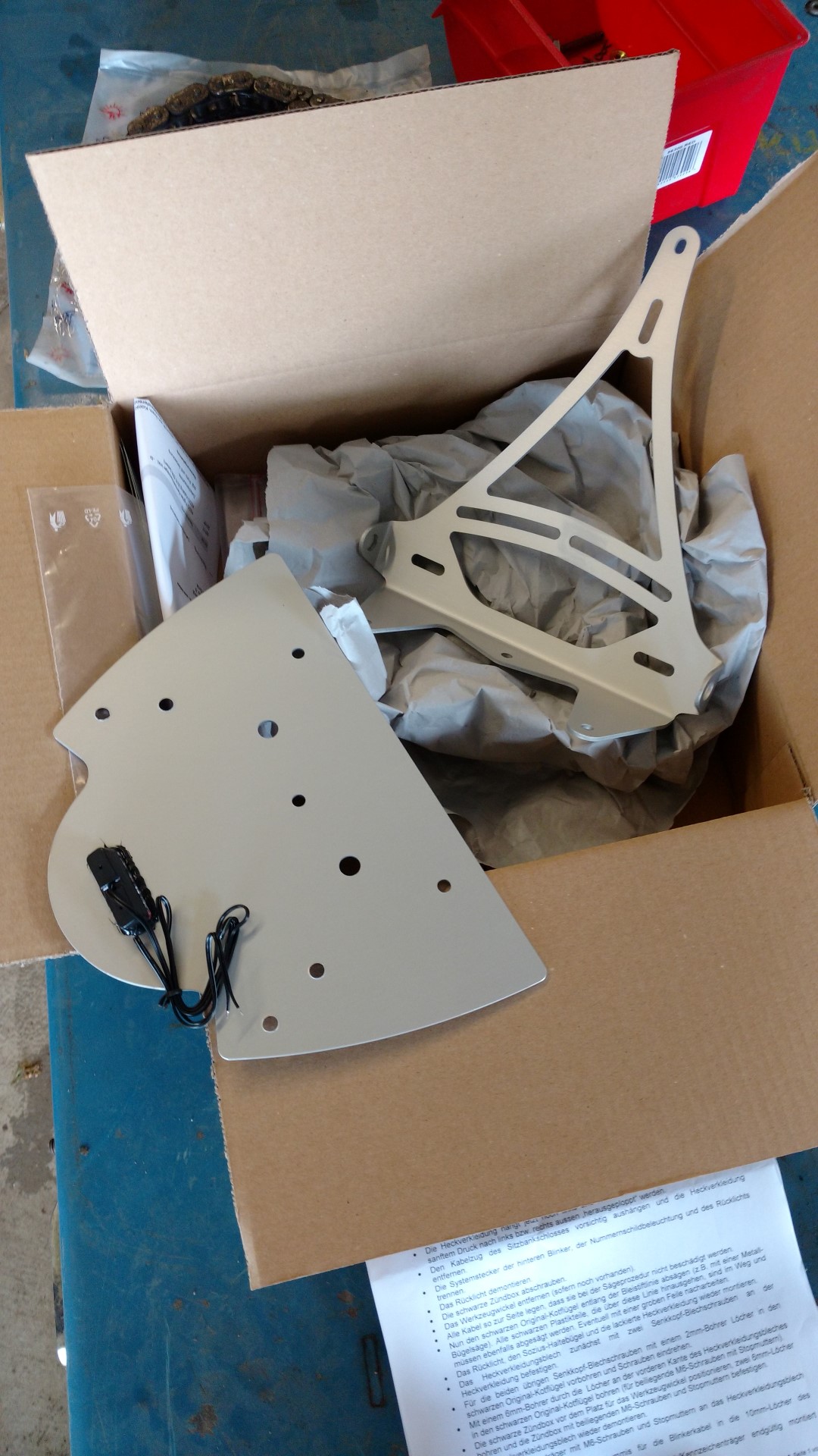 Einer der Vorbesitzer hat da nen echt dilletantischen Umbau drangezimmert. Einfach einen Winkel nach oben der die Lampe hält, allerdings nicht die Originale sondern irgendeine LED-Leuchte mit integrierter Kennzeichenbeleuchtung. Dann einen Winkel schräg nach hinten und unten für´s Kennzeichen und daran dann ein Querblech mit abgewinkelten Enden als Blinkerhalter.