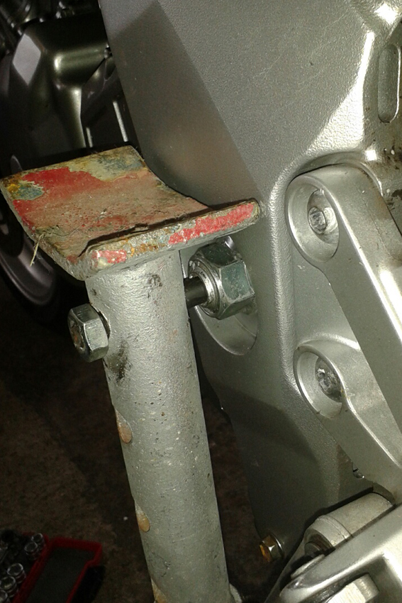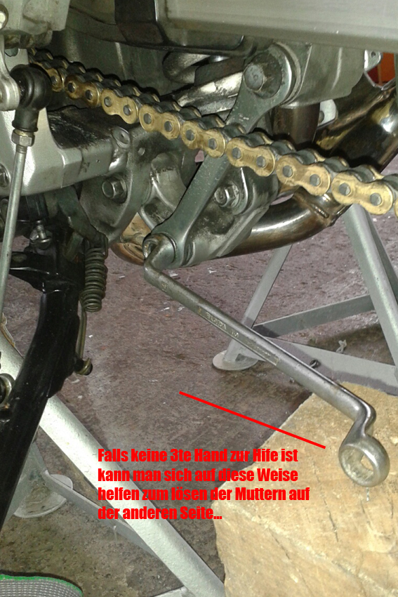 Nach dem die Muttern runter sind kann man die Schrauben auf der linken Seite rausziehen. Hat etwas gehakt, das kam von der Last der Schwinge und des Rades auf der Umlenkung. Wenn man das Hinterrad etwas anhebt / "wackelt" (s.Foto/Brett o.Ä. drunter als Hebel ) bekommt man sie problemlos raus.