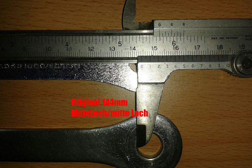 Im direkten Vergleich sieht man das die Zubehörumlenkungen nur 136mm haben (auch Lochmitte/Lochmitte) ...des einfacheren Messens wegen ist die Schieblehre natürlich am Rand angelegt :roll: