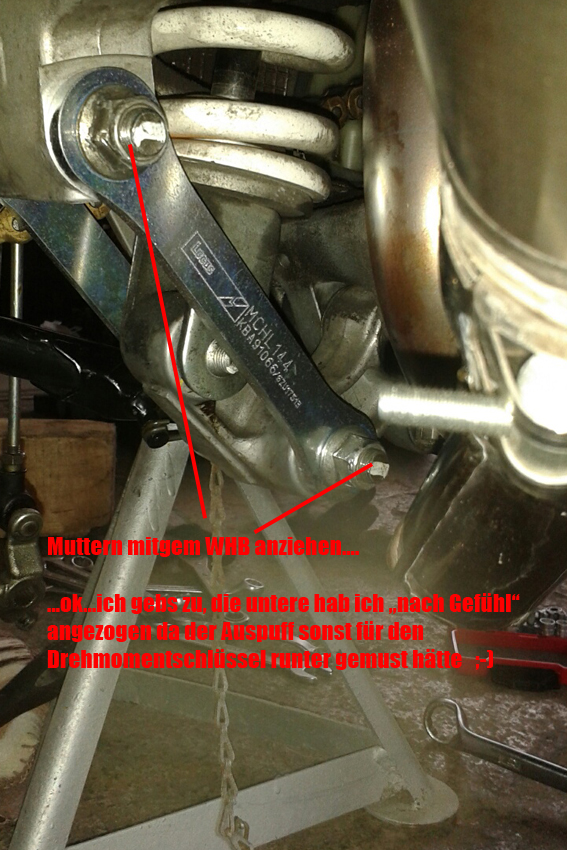 Wiederholungstäter hat geschrieben:Wenn du die Mutter auf der rechten Seite (Auspuff) mit einem Schraubenschlüssel festhälst, dann kannst du die Schraube links mit einer Verlängerung beaufschlagen, so hats bei mir funktioniert ...