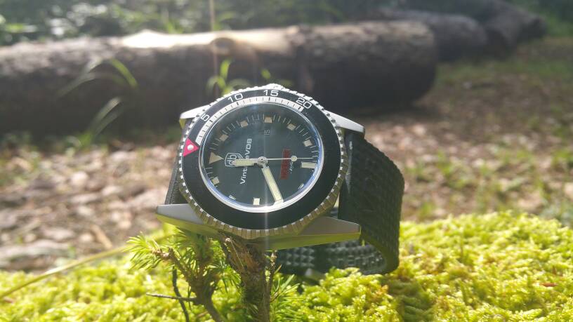Durch das breite Band (24mm) wirkt die Uhr auf den Fotos recht klein, hat aber mit 45mm Durchmesser eine schöne Größe.