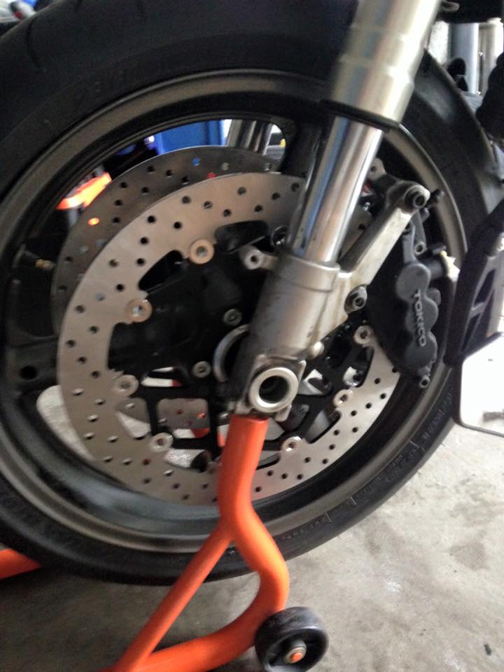 Dann musste das aktive Bremsmaterial her. Da ich, wie schon beschrieben, von gebrauchten Bremsen wenig halte musste etwas Neues her. Ich habe da noch unseren Dorfschrauber aus Schulzeiten im Kopf, der bei vordergründig finanziell gesteuerten Gebrauchtteileanfragen von uns Jugendlichen immer lachte „Benutzt ihr etwa auch gebrauchte Kondome?!“. An dieser Stelle nochmals vielen Dank an Hardy von HaReuTec (Forumshändler), der mich wirklich toll beraten hat und mit den Herstellerfirmen in Kontakt getreten ist! So habe ich mich dann für Brembo-Bremsscheiben entschieden – hinten gleich mit – inkl. knackigen Brembo-Belägen. Laut Hardy handelt es sich bei den Scheiben um die Erstausrüstung der 1098 und 1098 S. Kann also so schlecht nicht sein!