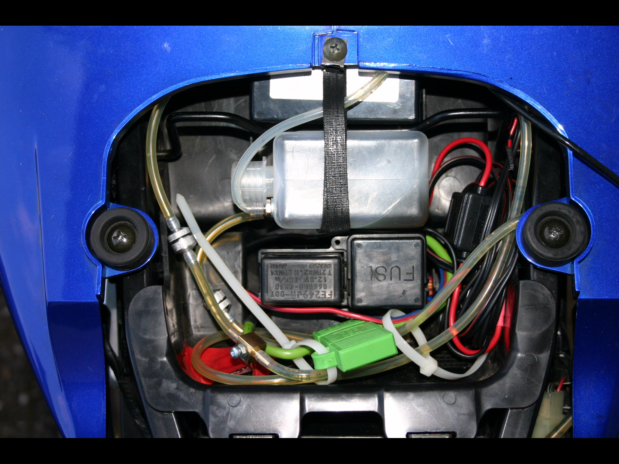 Ausbau der Batterie ist bei mir nicht ganz so einfach, da die Steuerung und der Tank des Kettenölers unter dem Sitz sitzt. Deshalb habe ich Spannungsversorgung vom Navigationsgerät auch durch einen Stecker getrennt an dem ich auch das Ladegerät anschließen kann.