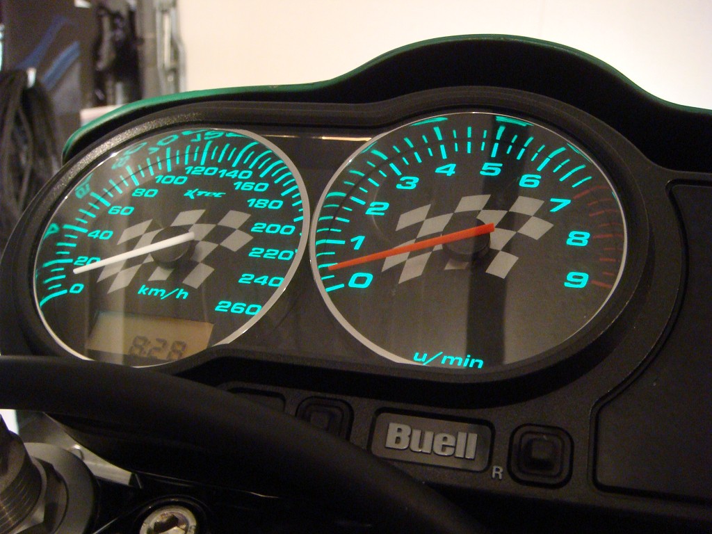 Was bei der SV kaum möglich ist, ist bei der Buell kein Problem. Tachoumbau mit Chromringen, LEDs und Design nach meiner Vorstellung: