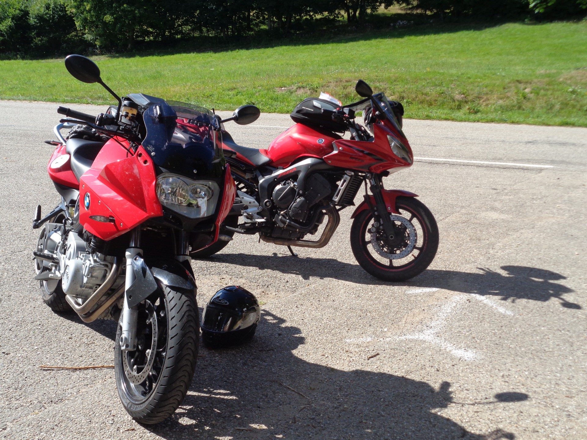 Bin eben zurück aus den Bergen, habe zusammen mit einem guten, alten Freund auf Yamaha Fazer 1100km in 2,5 Tagen erlebt - was selten ist und super passt, weil wir beide denselben Fahrstil haben: ohne zu rasen,aber mit viel Schräglage unter Zug durch die unzähligen Kurven & Kehren und ordentlich rausfeuern - die Reifen haben also dramatisch an Profil verloren. :mrgreen: Dabei hab ich mich etwas besser auf die Eigenheiten der F800 "eingeschossen": Schon unglaublich wie der Motor mit nur 800 ccm im 3. oder wenns ganz eng wird auch im 2. Gang quasi ab Leerlaufdrehzahl rundläuft und aus den Ecken drückt ;) bier Der LeoVince tönt dort vollmundig dazu, soweit alles gut im unteren Drehzahlbereich. Der Durchzug im Bereich 4000-5000 U/min ist objektiv auch noch gut, also bei meiner F800 kein Drehmomentloch sondern eher eine leichte Delle, da subjektiv nicht so beeindruckend wie ganz unten und auch nicht so wie bei der spürbar besseren Drehfreude die danach noch einsetzt - allerdings muss man sich oben raus trotz LeoVince an die andere Geräuschkulisse gewöhnen - eine Mischung aus Scheppern und Schnarren - einstellen :shock: Das Getriebe schaltet leider sehr hakelig, in den Gängen 5 und 6 nur mit Nachdruck, da man sonst leicht im Zwischenleerlauf landen kann, aber die braucht man eh nur auf Verbindungsetappen oder beim Rollen, sonst geht alles im 3. oder 4. Gang, es sind also auch kaum Gangwechsel am Pass nötig.
