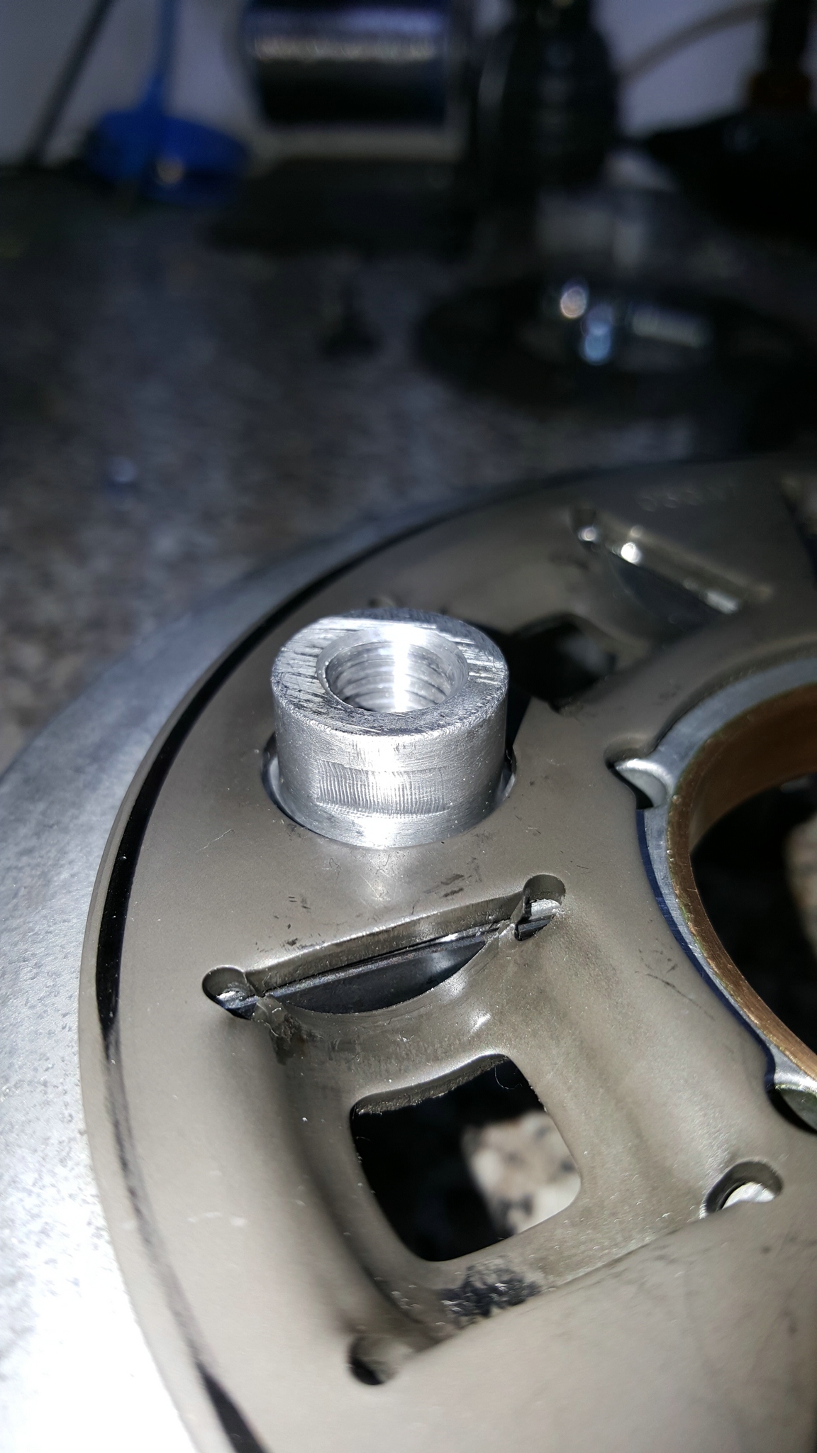 Da jetzt die Auflagefläche aus Stahl besteht und sich das Einlegeblech vollflächig ins Aluminium einarbeiten müsste, solle künftig auch die Haltbarkeit gegeben sein. Hier ist zu sehen das die Geometrie zwischen Kupplungskorb und Federtaschenkorb wieder hergestellt ist. In die Zapfen sind M10 Gewinde geschnitten.
