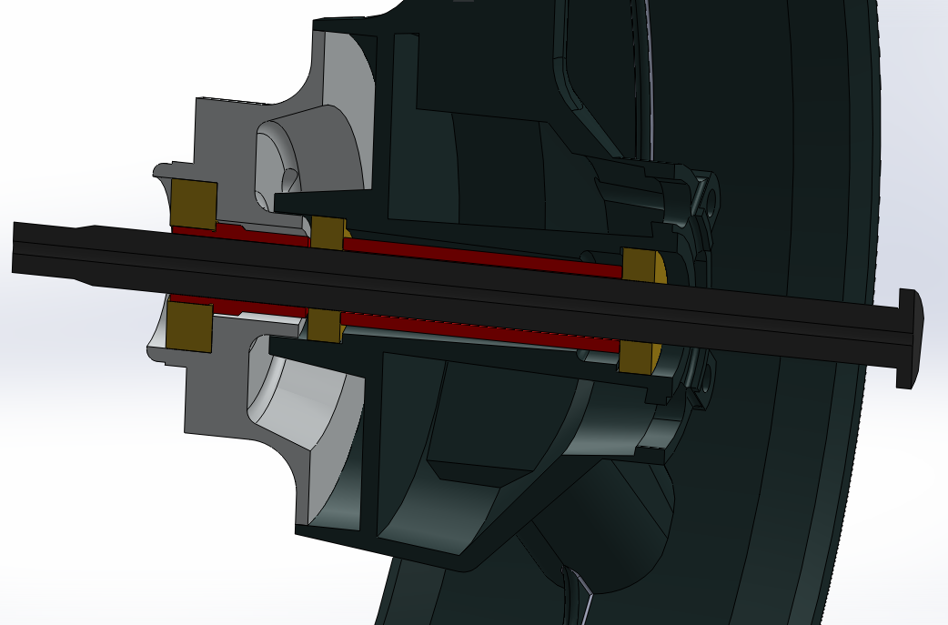 Ein weitere Luftspalt entsteht zwischen der Distanzbuchse des Kettenradträgers und dem linken Lager der Felge , dort sollte ja eigentlich auch kein Abstand sein oder ? Ich habe das Lager des Kettenradträgers im CAD auch gleich durch ein größeres ersetzt. Originl ist da ja eines mit 25mm Innendurchmesser verbaut und mit der roten Distanz zusätlich kommt man auf die 20mm die der alte Boltzen hatte.Hier muss ich ja auch alles auf den 25mm Bolzen anpassen. Da die Felgenlager auch noch schmaler sind muss die rote Distanzhülse auch noch um die Differenz länger werden.