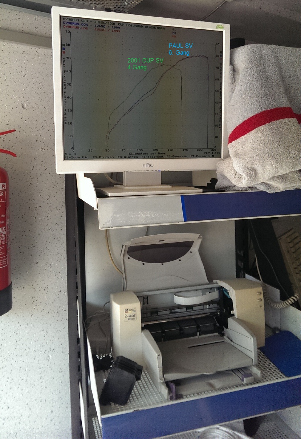 Leider ist auch noch genau an dem Tag der Drucker von dem Prüfstand kaputt gegangen und ich habe keine ausgedruckten Diagramme mit der Schleppleistung bekommen, mit der man auf die Motorleistung schließen könnte.