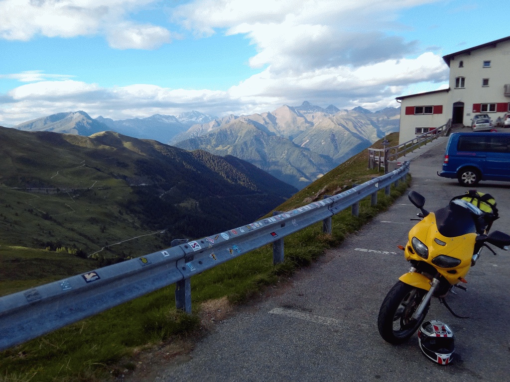Kaffee, Saft, halbe Semmel, abgerechnet hatte ich schon am Vortag, gegen 6.30 ab aufs Mopped und weiter, nochmal vollgetankt in Österreich, Sprit ist ja in Italien unbezahlbar.