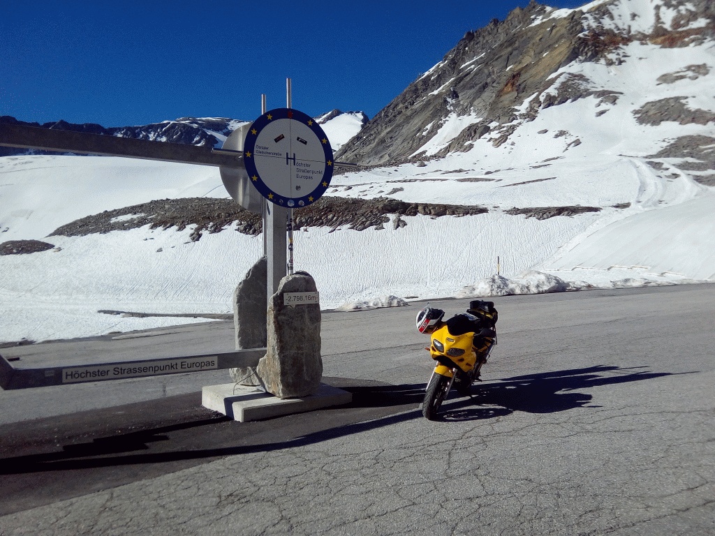 Weils fast am Weg liegt noch ein Abstecher aufs Stilfser Joch, 10 Kehren rauf, die Abfahrt Richtung Prad ist wegen der beschissenen Sportveranstaltung gesperrt, oben wird fleißig der Zieleinlauf aufgebaut. Hat aber auch Vorteile, wenig Verkehr; Die Sperre war tatsächlich vorher durch Schilder angekündigt.