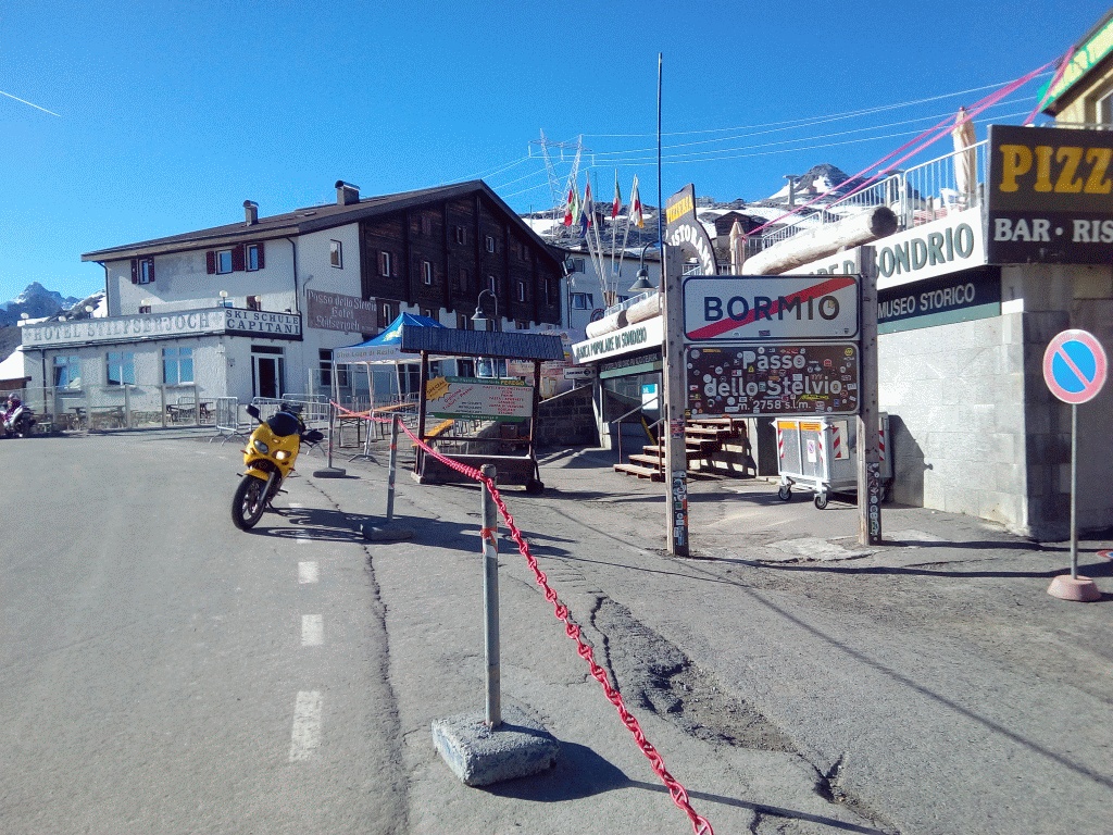 Weils fast am Weg liegt noch ein Abstecher aufs Stilfser Joch, 10 Kehren rauf, die Abfahrt Richtung Prad ist wegen der beschissenen Sportveranstaltung gesperrt, oben wird fleißig der Zieleinlauf aufgebaut. Hat aber auch Vorteile, wenig Verkehr; Die Sperre war tatsächlich vorher durch Schilder angekündigt.