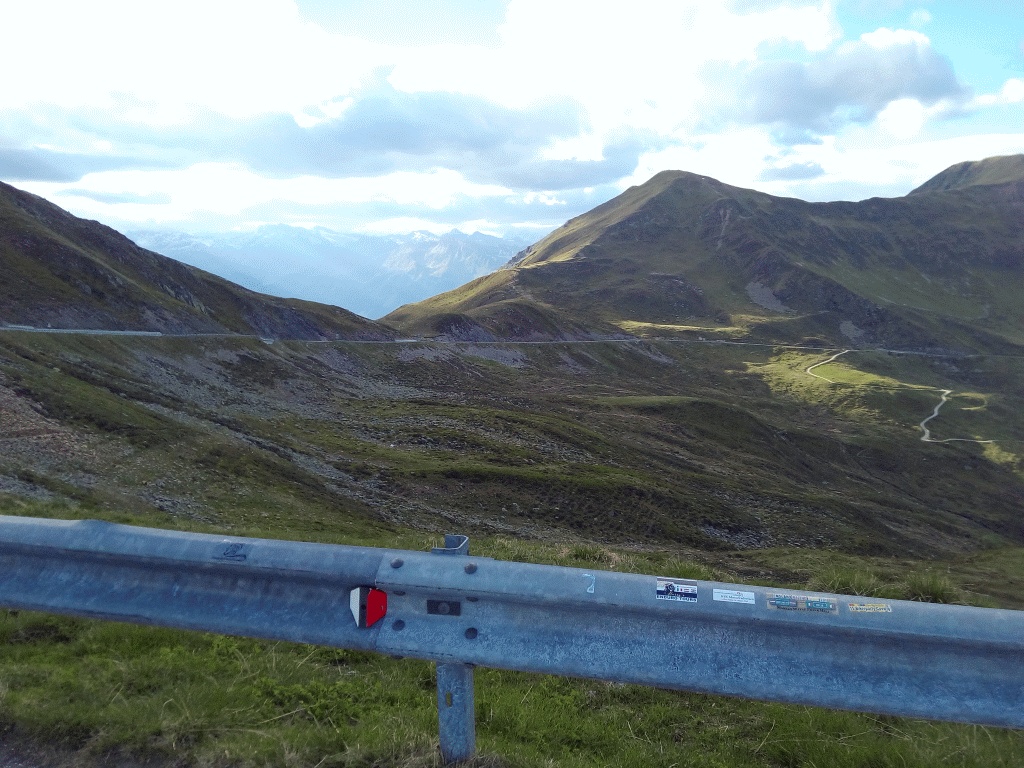 Ich lass mir Zeit, mach nochmal Bilder und fahre dann über die Passhöhe nach Österreich rein, dort steht ein Schild: „Vorsicht Straßenschäden“…die Straße ist gut, ich glaube die sollten mal einen Blick nach Süden werfen, da wäre das Schild angebracht.