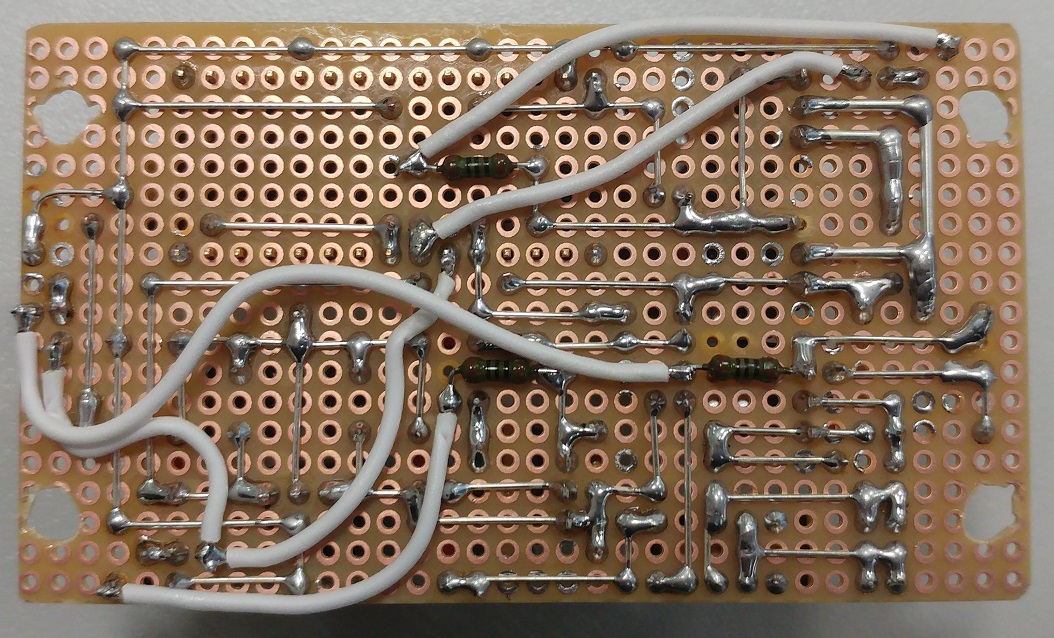 Die Platine: Leider musste ich dann doch noch auf der Unterseite bestücken und diverse Brücken ziehen, da die Schaltung im ersten Anlauf nicht so funktionieren wollte wie sie sollte