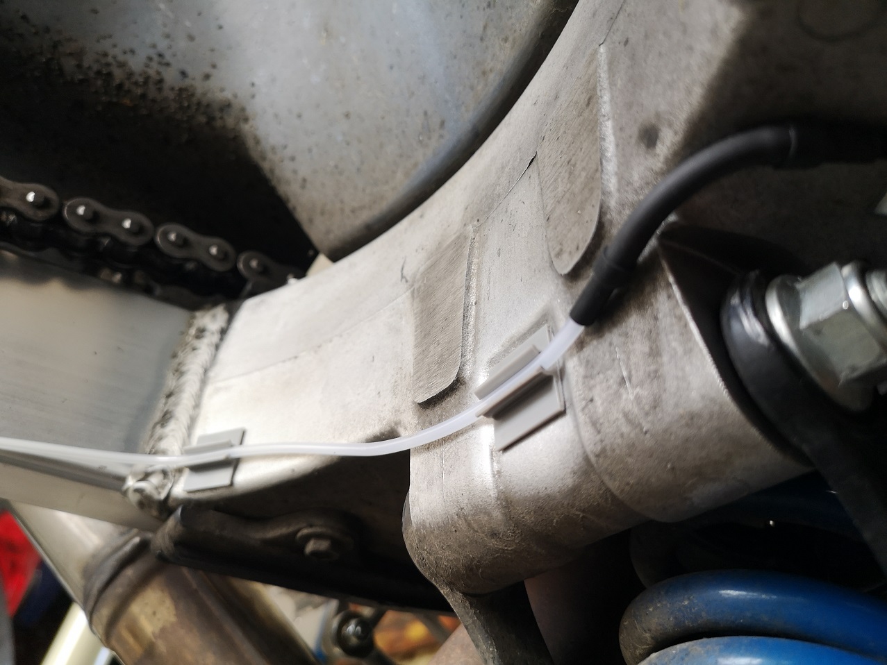 Jedoch war das nächste Problem relativ schnell lokalisiert. Der originale Bremszylinder hat "Führungsstege" für den Fitting. Also kurzerhand mit Diamantscheibe & Dremel ab damit: Weiter ging es mit dem Bau eines vernünftigen Halters aus einem 2mm Edelstahlblechstreifen. Dieser ersetzt nun gleichzeitig die Verbindungplatte zwischen Fersenschoner und Heckrahmen: Erstmalig montiert sieht das dann so aus: Schlauchverlegung unter die Schwinge ist relativ simpel, ich habe einfach das Loch in der Schwinge dazu genutzt: Unter der Schwinge mit einer Schlauchschelle fest fixiert (Loch gebohrt und M5-Gewinde geschnitten), damit an dieser Stelle erstmal alles wirklich fest ist!