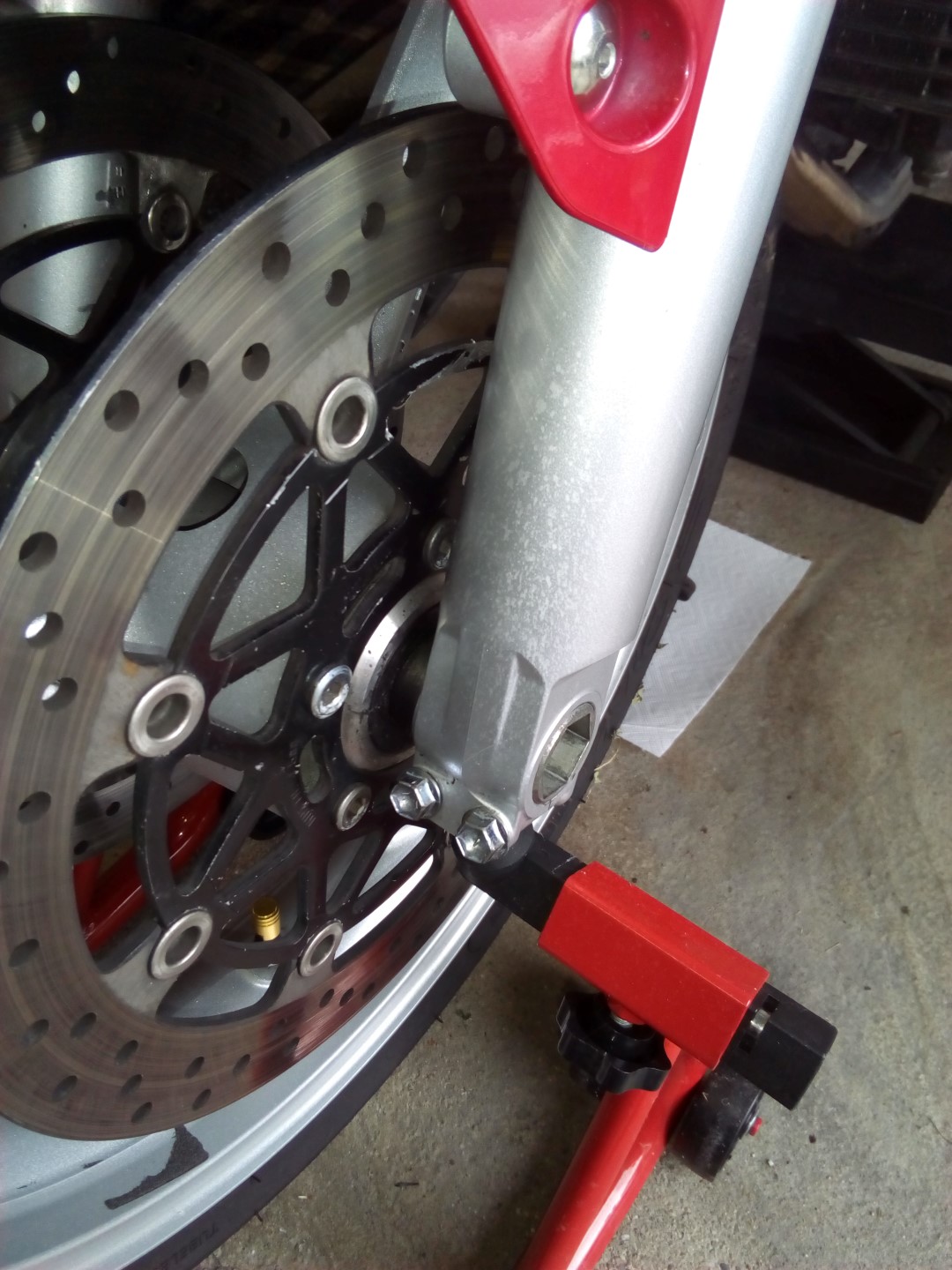 Als nächstes den Bugspoiler runter, damit ich unterm Motor noch den Scherenheber packen kann. Dieser dient zum einen zum zusätzlichen Stabilisieren, zum anderen kann ich später die Gabelholme rausnehmen ohne das mir der Bock nach vorne wegfällt. Logischerweise muss zum normalen Radausbau dieser aber nicht verwendet werden. Ich benutze die beiden Aufnahmen die eigentlich für Rohrahmen gedacht sind die unterm Motor verlaufen, um nicht mit dem Krümmerrohr ins Gehege zu kommen. Beide sind gummiert. Die Seite beim Krümmer liegt so auf, unter die andere kommt bei mir noch nen Holzkeil um den kleinen Höhenunterschied auszugleichen. Beide Ständer und den Heber habe ich übrigens von Ricambi-Weiss. Ständer-Set ~40€, Scherenheber ~41€. Funzen super! Allerdings werde ich mir für hinten noch die Aufnahmehülsen für an die Schwinge plus passende Adapter für den Heber besorgen. Gibt etwas mehr Arbeitshöhe...