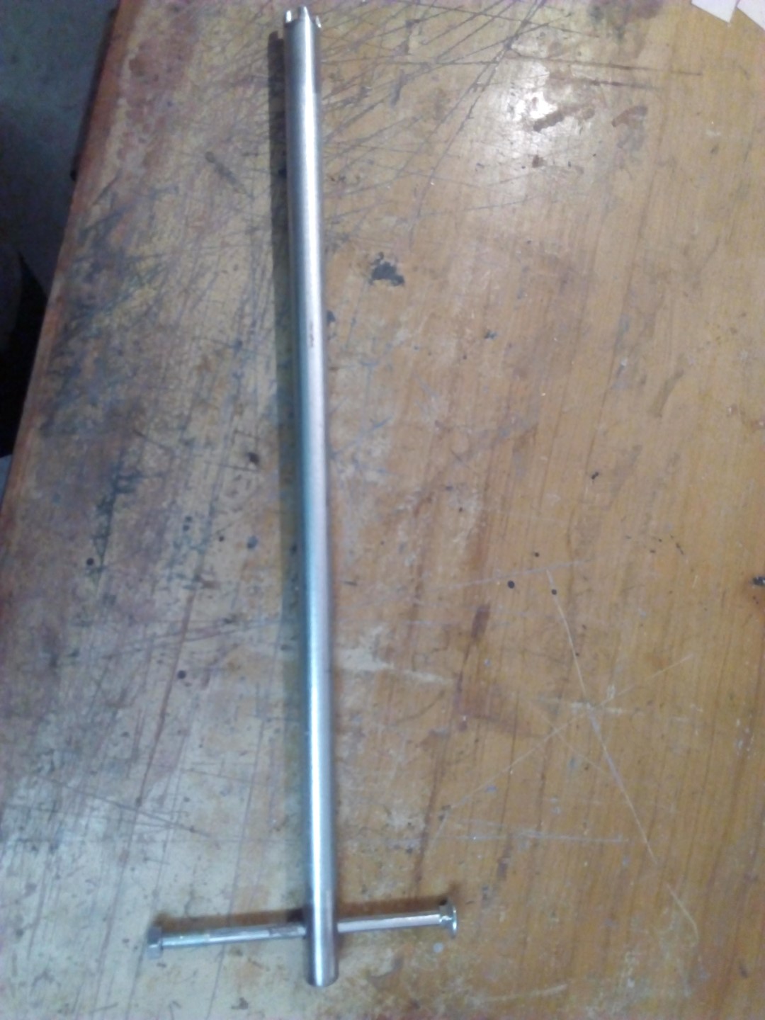 Als erstes hab ich die Gewinde vom Rohr abgesägt und die Enden ein wenig am Tellerschleifer "geschönt" (muss man aber nicht). Mit den abgeschnittenen Stücken kommt das Rohr dann auch ziemlich nah an die 42 cm Länge (glaube ich iwo gelesen zu haben..!?) vom OEM Teil ran.