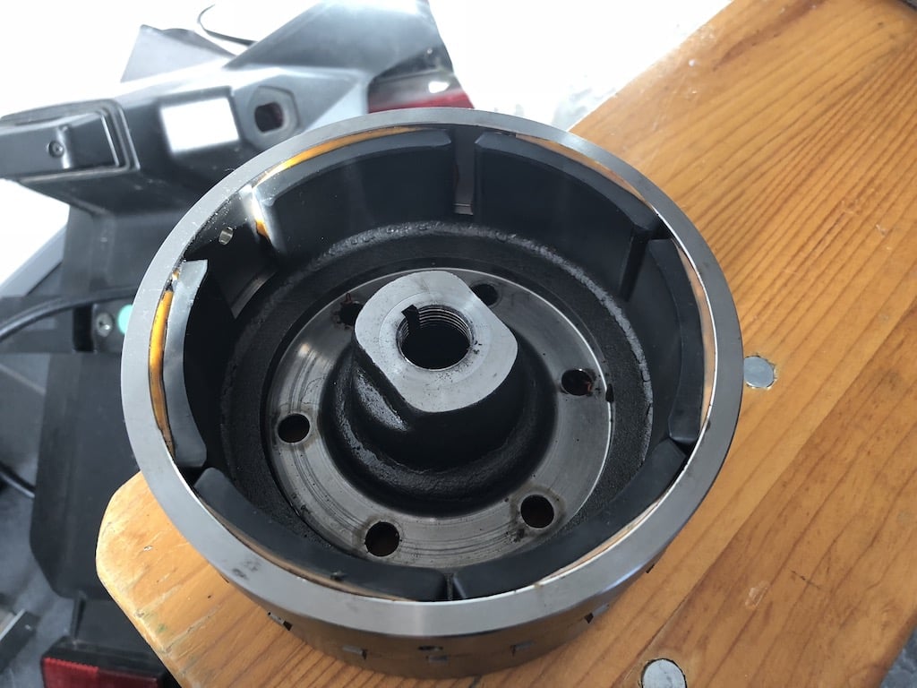 Das Polrad wird mit 114 oder 120 Nm? angezogen und presst sich durch die Kegelförmige Aufnahme richtig fest, da bedarf es ordentlich Hebel und oder ein paar gezielte Schläge an der richtigen Stelle.