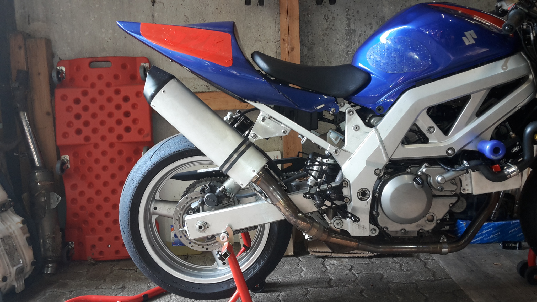 Vor zwei Jahren habe ich von einem Kumpel einen GPR Furore abgekauft. Der war für eine 450er Suzuki RMZ. Das zur RMZ gehörige Verbindungsrohr ist im Durchmesser viel zu klein für die SV. Aber der Anschluss am Auspuff war groß genug, und ein anderer Kollege hatte noch ein Verbindungsrohr von der GSXR 1000 K3 von einem BOS Auspuff übrig. Wenn man das alles richtig anpasst, und dann von jemandem zusammenbraten lässt, sieht das so aus.