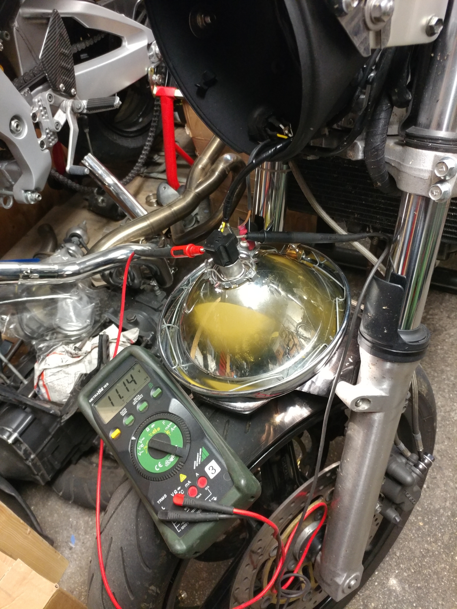Ich habe vorhin mal die GS durchgemessen (Naked, Rundscheinwerfer). Es kommen bei Standgas 12V am Abblendlicht an, Fernlicht 11,5V, trotzdem habe ich nur ein Teelicht drin. Mglw ist auch die Birne alt, no-name oder der Reflektor ist blind.