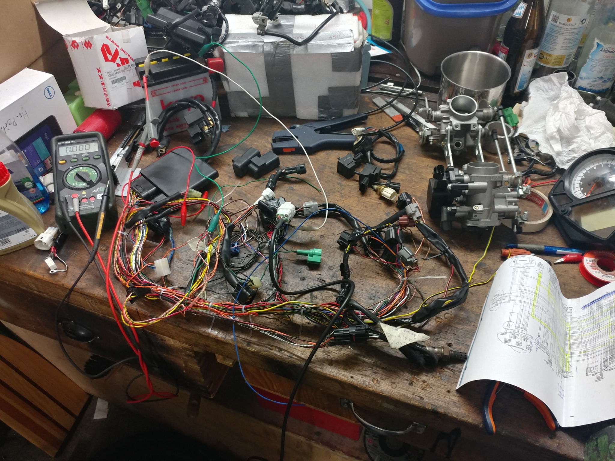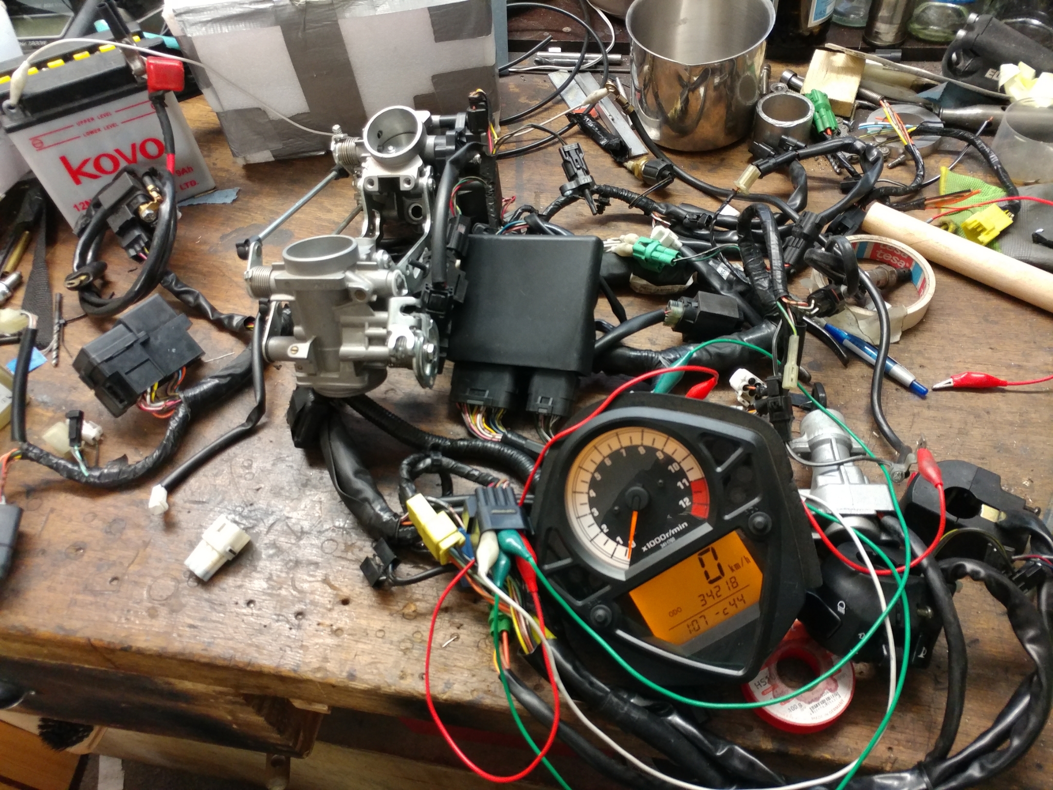 Jetzt ist erstmal kein Testen mehr möglich, ich habe den Kabelbaum weiter gestrippt. Denn ich gehe jetzt einfach mal davon aus, dass ich den Fehler finden werde. Beleuchtung, Sichrungskasten, Hauptrelais, Armaturen und Tacho sind jetzt weg. Bin ja mal gespannt ob der Fehler immer noch da ist wenn man die ECU wieder mit Strom versorgt. Wie auch immer, hab auf jeden Fall jetzt schon einiges mehr über die K7 Elektrik gelernt :D